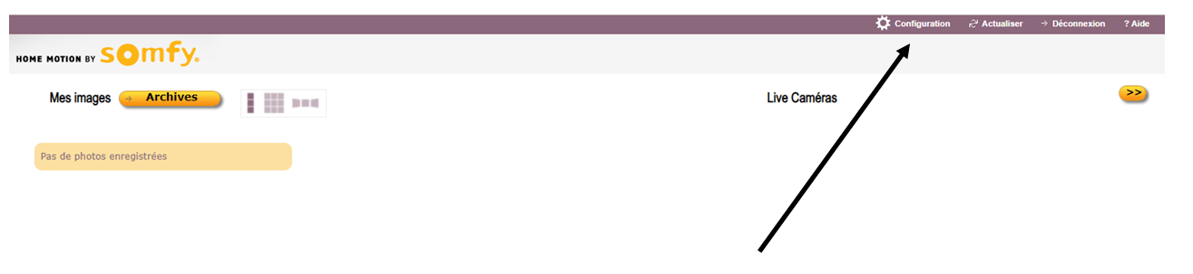 Après connexion en mode utilisateur sur https://alarmsomfy.eu, vous devez avoir cet écran avec "Configuration" en haut à droite.