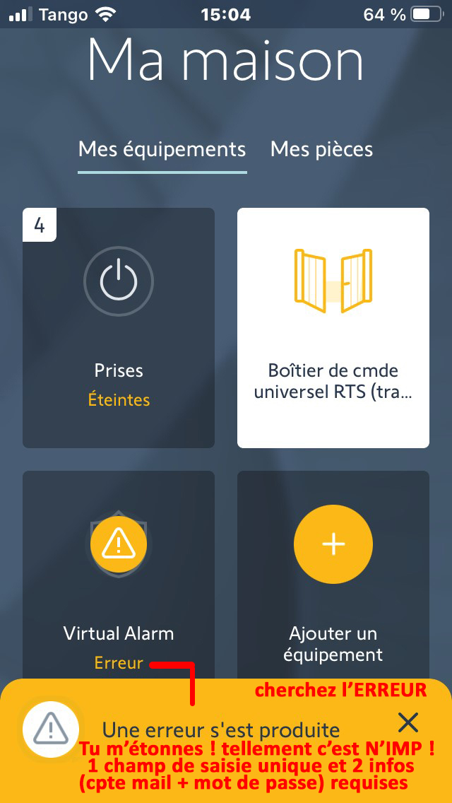 Depuis l'installation de ma Tahoma Switch il y a quelques semaines, j'ai régulièrement certains de mes équipements, voir tous, en erreur sur l'application Tahoma Switch.