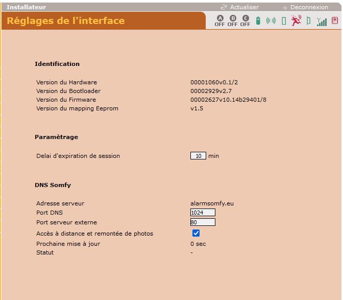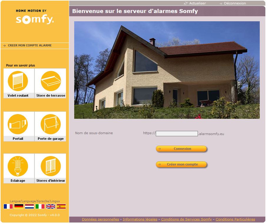 L'accès au compte serveur d'alarme Somfy est refusé (données identification incorrectes??)création d'un nouveau compte aussi impossible, Débrancher et rebrancher le bloc secteur" ne provoque rien.