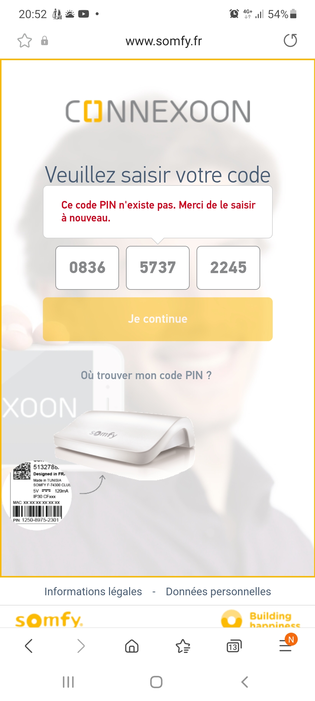quand je rentre le code pin de la box connexoon il me mais code n existe pas le code est 0836-5737-2245 merci de m aide