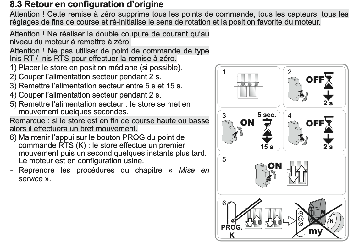 1)appui long sur le bouton PROG de la télécommande: le store effectue un va et vient, comme prévu.