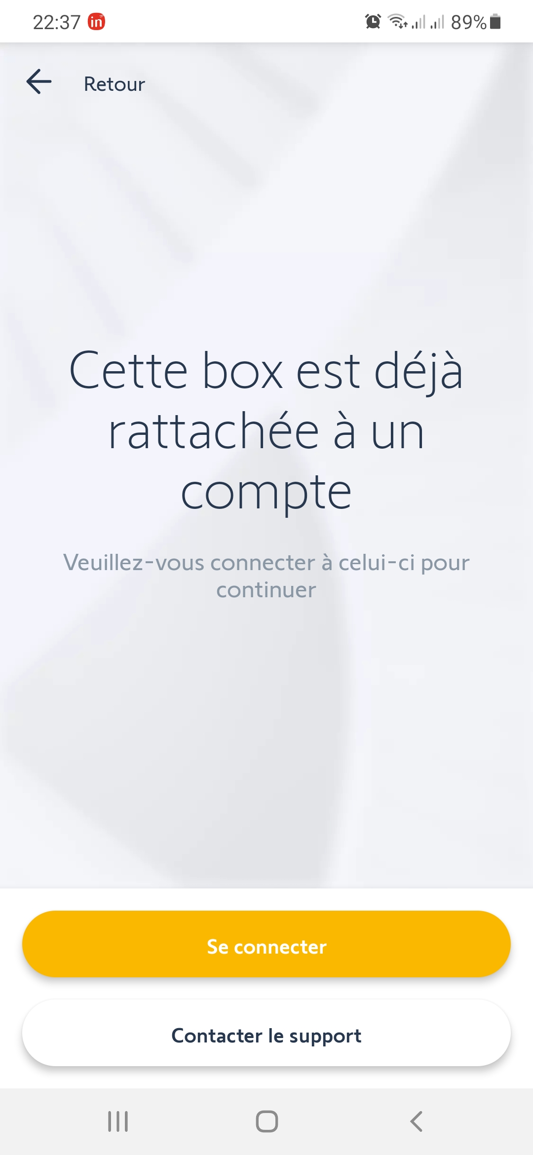 ensuite j'ai voulu le faire sur leurs téléphones, mais ça me dit que la box est déja rattachée à un compte, pas de soucis je supprime mon compte via l'appli de mon téléphone, mais de retour sur leur téléphone le message reste identique alors que j'ai eu la confirmation de la suppression de mon compte via email.
