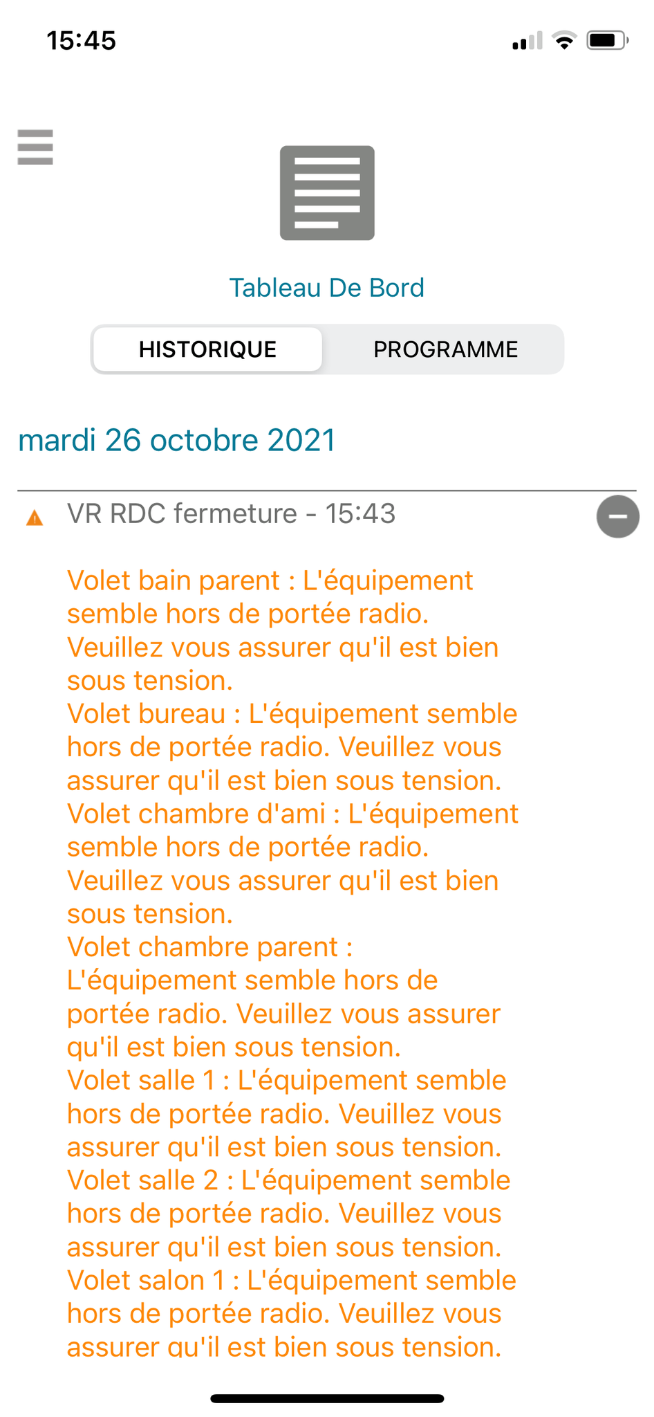 Depuis le 22 octobre 2021, ma box Tahoma ne commande plus mes volets roulants ni mes portes de garage, le matin UNIQUEMENT, via les scénarios, par contre le soir tout fonctionne ! La box est allumée en blanc, je l'ai éteinte et rallumée. Certains équipements se sont ouverts automatiquement depuis le 22 octobre et pas d'autres, et certains matins tout est resté fermé. Je suis très perplexe. Merci pour votre aide.