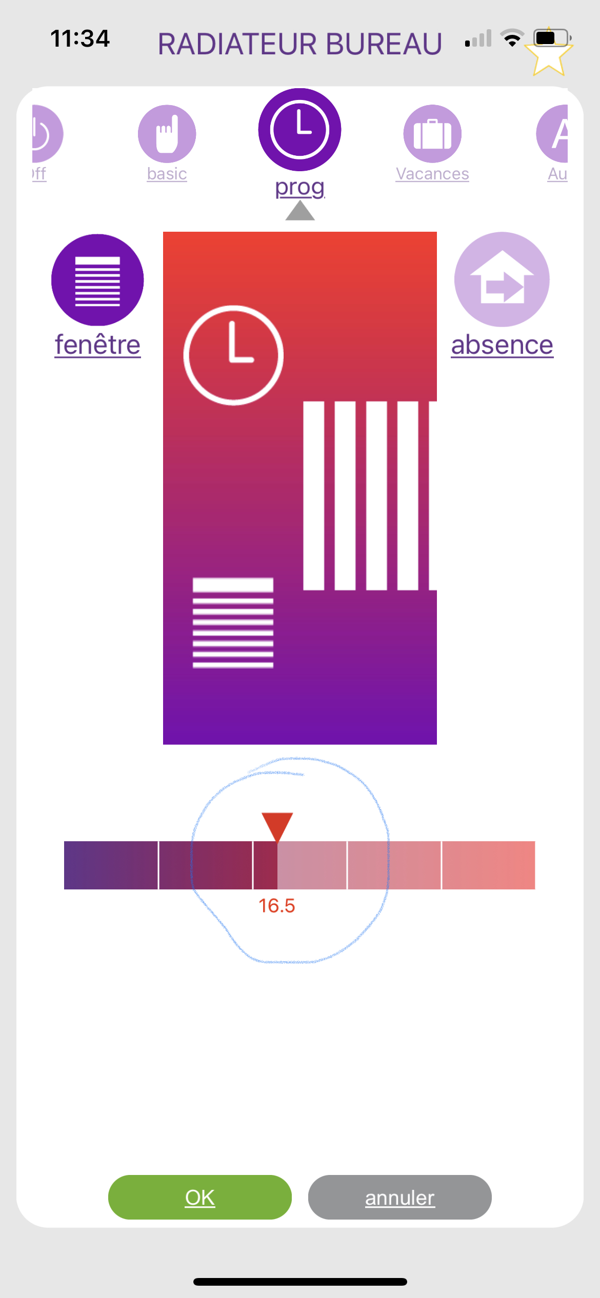 Par contre, lorsque je me connecte au radiateur via l'appli Tahoma sur Iphone, le statut du radiateur est le mode "Réduire" (16,5°)....