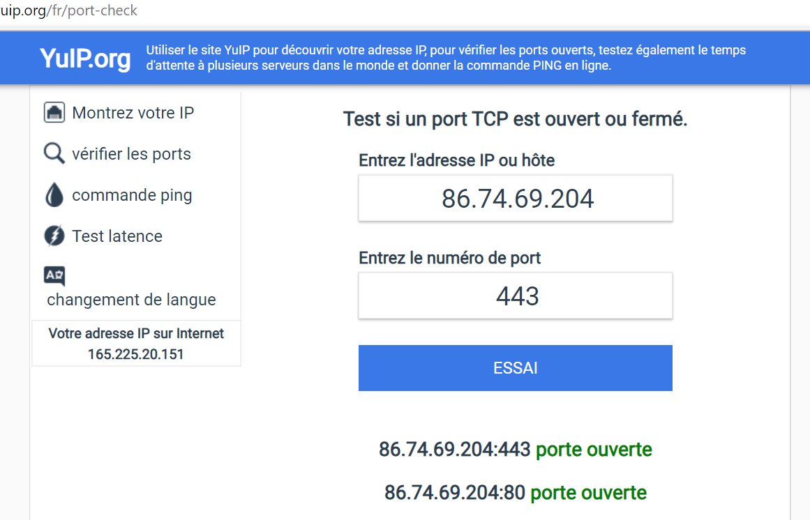 Je viens de remplacer max box SFR PLUS par unebox SFR FIBRE NB8. Visiblement elle fait de l'IPV4/IPV6. J'ai trouvé les explications et j'ai crée les règles de redirection des ports 80 et 443 (cf screenshot), j'ai redémarré la box. Le firewall intégré n'est pas actif, ....Impossible de me connecter à partir de mon téléphone en 4G (bien entendu en WIFI ça marche). Le site http://yuip.org/fr/port-check me confirme que les ports sont inaccessibles.