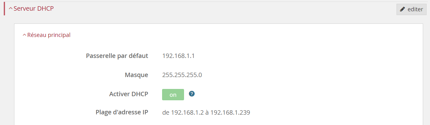ATTENTION: il faut bien désactiver l'option "Activer DHCP" pour éviter que cette adresse ne change. Dans la box, s'assurer que l'adresse IP choisie est bien en dehors de la plage du DHCP (cf mon screenshot) ==> le DHCP de la box ne la changera pas.