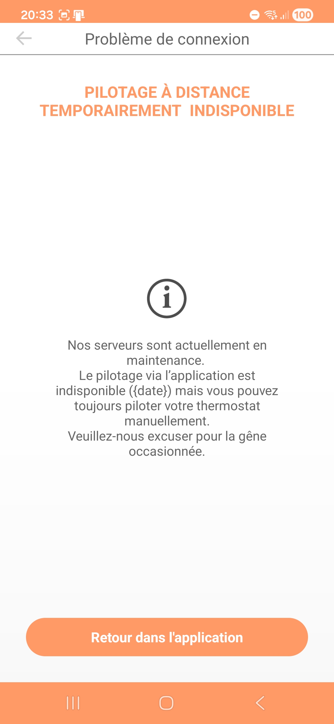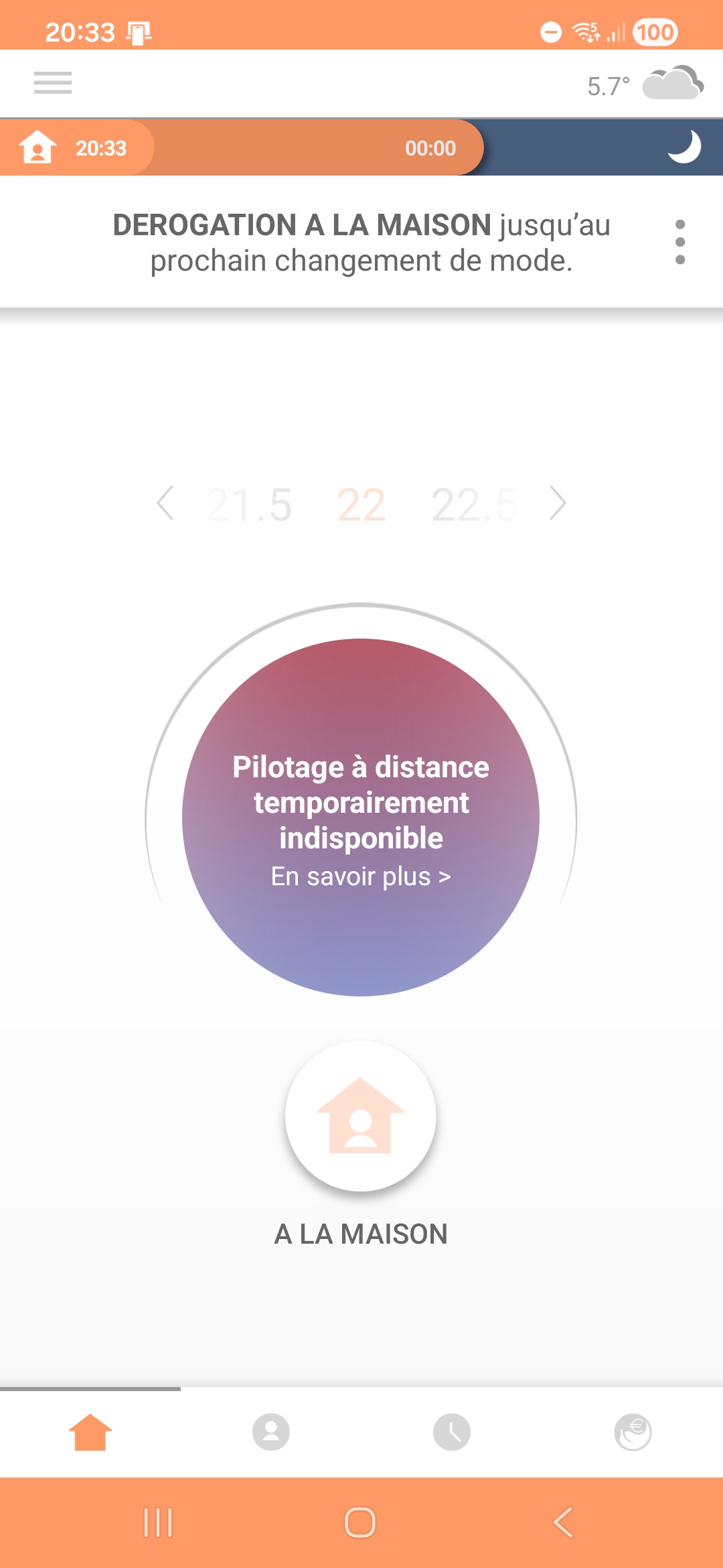 Ce qui est étrange, si je n'arrive plus a commander le chauffage via l'app, lorsque je demande a mon enceinte Google de démarrer ou arrêter le thermostat, elle le fait (donc il se met en mode hors gel, ou en mode maison selon ce que je demande). En manuel, il fonctionne toujours.