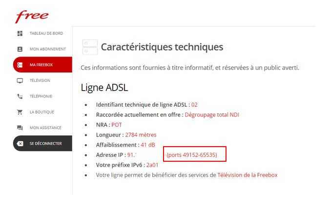 Connectez vous sur votre compte FREE et aller voir votre adresse IP. Y a t'il derrière une tranche de Ports comme sur la copie d'écran jointe.