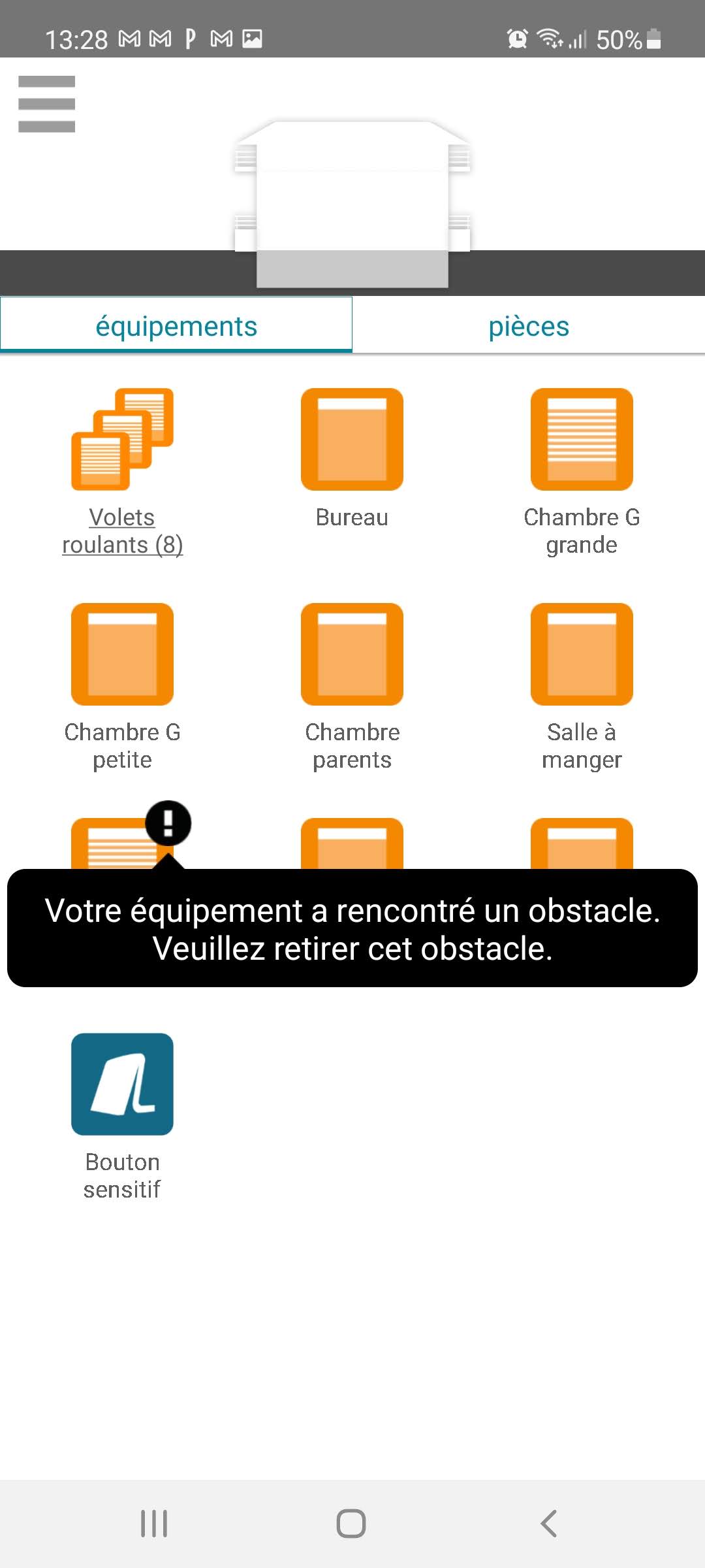 Lorsque je ferme ces volets avec l'application, ils se ferment tous correctement. Cependant sur l'un d'entre eux, j'ai ce message "Votre équipement a rencontré un obstacle. Veuillez retirer cet obstacle". Or il n'y a pas d'obstacle et le volet est fermé totalement.