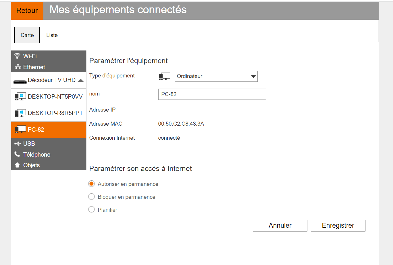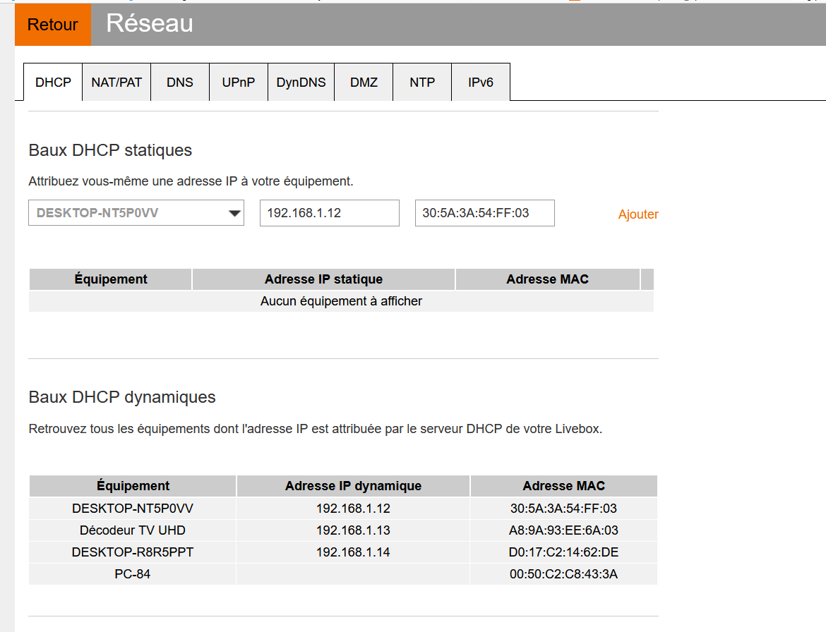 J'ai regardé dans la rubrique "matériel connecté" pour voir les détails, et je me suis aperçu que l'alarme a bien une adresse MAC, mais aucune adresse IP n'apparaît. Les autres appareils connectés ont tous les deux adresses (IP et MAC).