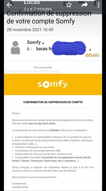 Ce dernier m'a envoyé, pour confirmation, le mail de suppression de son compte envoyé par SOMFY en date de 28/11 ... mais n'a pas du dissocier l'alarme avant ... car j'ai toujours le message m'indiquant que le matériel est déjà associé.