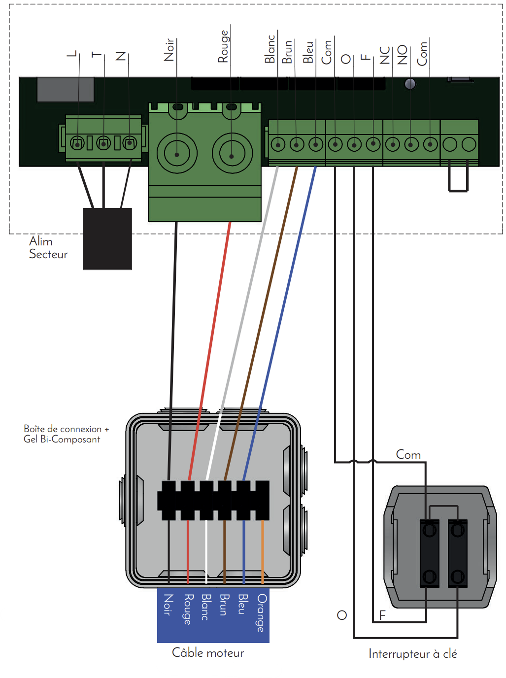 Si vous pouviez juste indiquer ce que vous mettez au pied du volet coté 24v et clef et ce que vous mettez au niveau du boîtier 220v, serait parfait
