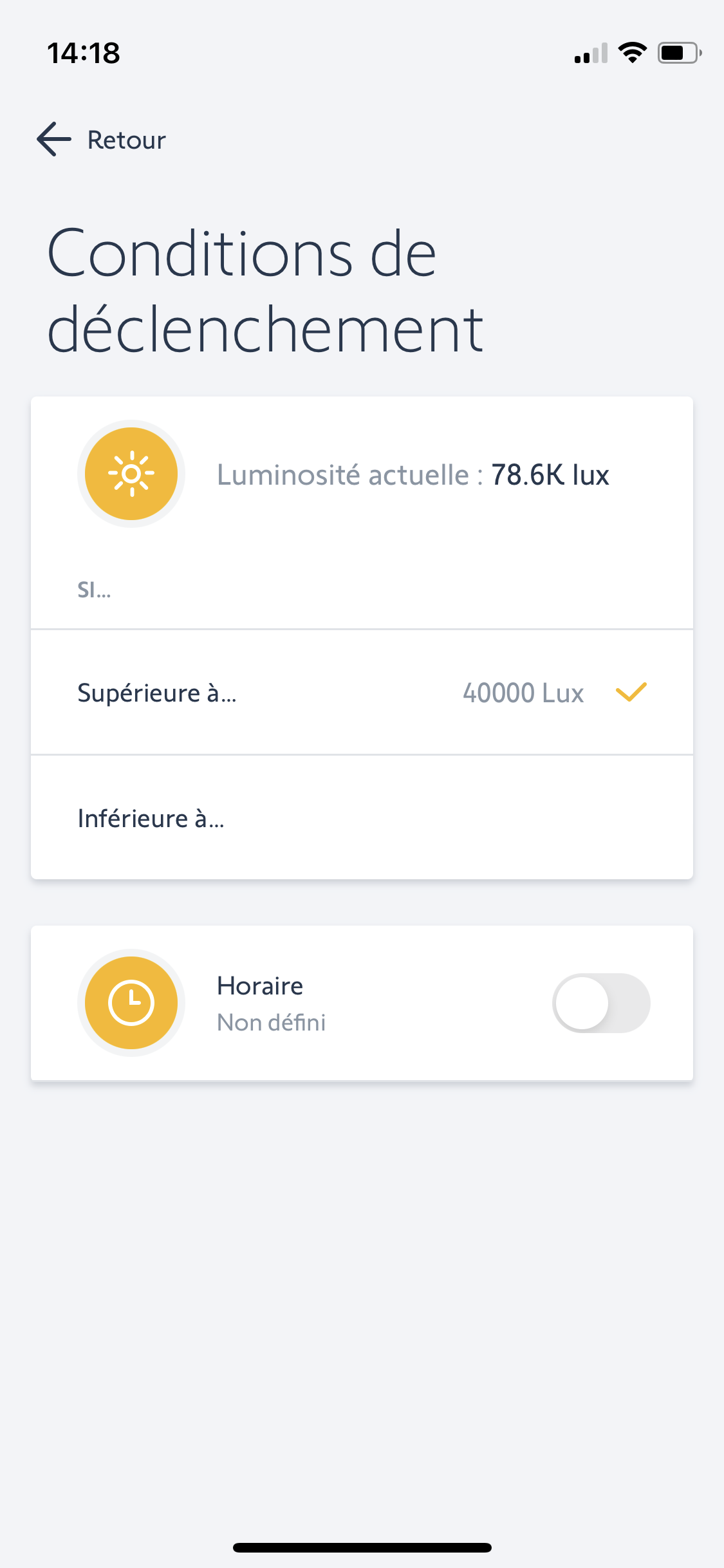 Bonjour et merci pour la réponse. Cependant, ma question était mal formulée, je reprécise : dans le scénario confort thermique en mode hiver par exemple, je souhaite que mes volets roulants s'ouvrent à l'aube à la même heure les 5 jours ouvrés de la semaine et à une heure plus tardive le week-end. Hors l'application ne permet pas de différencier les horaires sur des plages journalières différentes., me semble-t'il. A moins que vous trouviez une astuce qui m'a échappé !