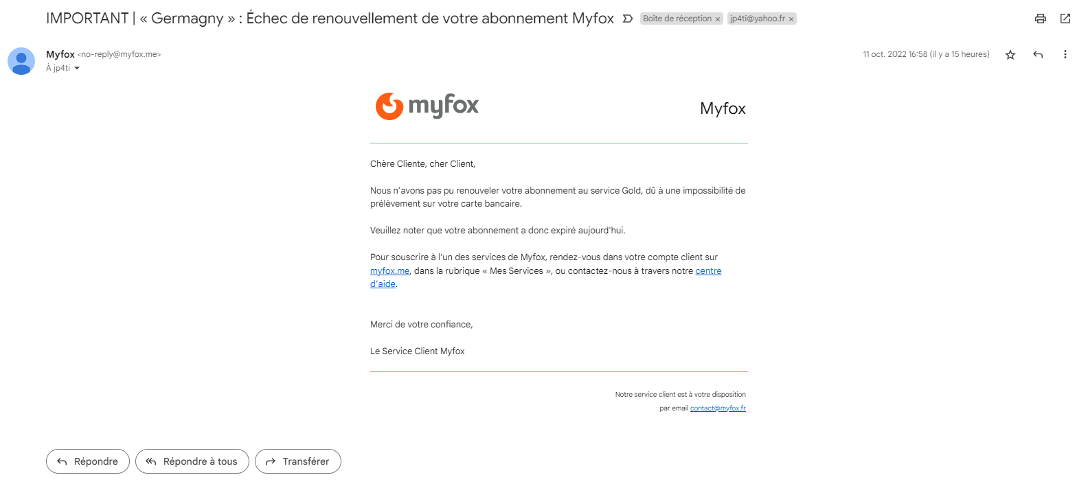 Mon paiement pour le service Myfox Gold a été rejeté pour une raison inconnue.