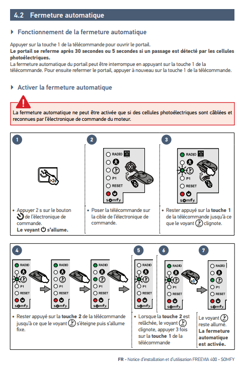 Ayant fait l'acquissions d'un moteur freevia 400, je reviens vers vous car il est impossible de paramétrer la fermeture auto du portail (dernier paramètre à faire), même en suivant le guide d'installation... Je pense que le problème provient que par défaut j'ai mon voyant P1 qui clignote, même après un reboot du moteur, je pense qu'il attend la fin d'un paramètre...mais lequel.. Merci de votre aide