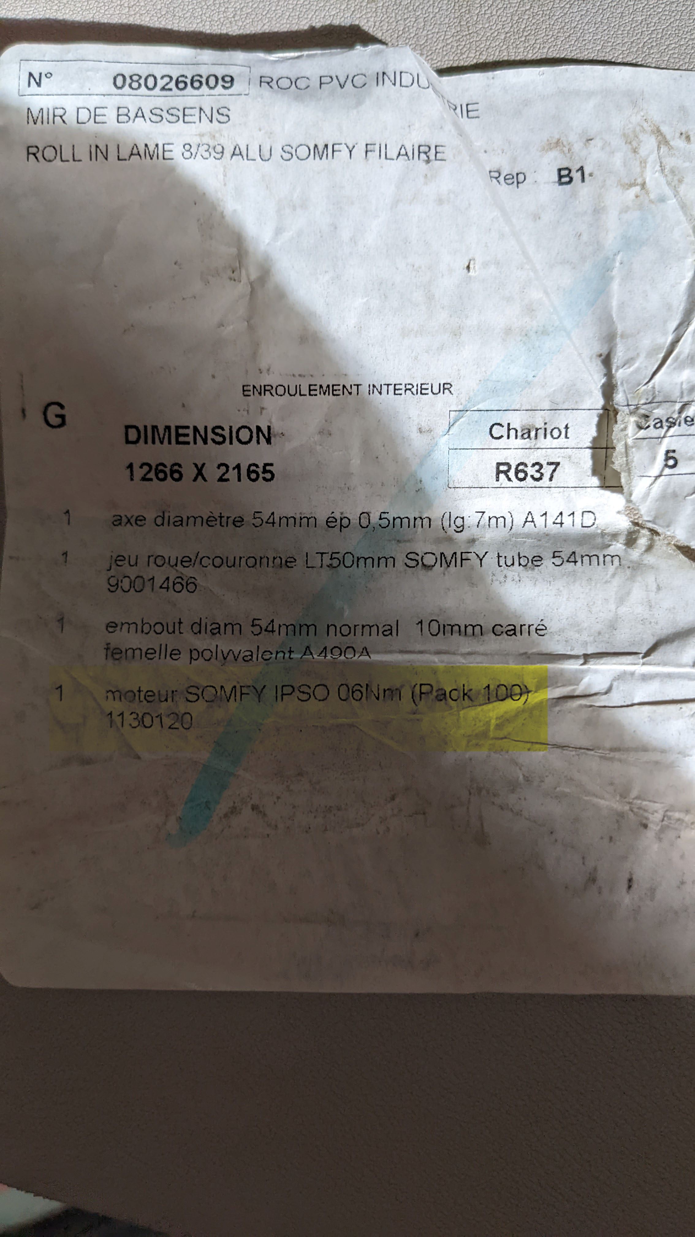 J'ai un moteur de volet en panne avec les caractéristiques suivantes : "Moteur SOMFY IPSO 06nm (Pack 100) 1130120" et impossible de retrouver cette référence dans son exactitude en ligne. Je trouve des choses approchantes mais jamais pareilles. J'ai compris que la gamme n'existait plus, mais je ne sais pas avec quoi la remplacer. J'ai bien trouvé ce fil de discussion : https://forum.somfy.fr/questions/634727-remplacement-moteur-ipso-6-th-6nm-ipso50-17rpm mais voilà, encore une fois, je sais pas si ce moteur est compatible avec mon installation ou si https://boutique.somfy.fr/kit-de-remplacement-pour-moteur... est universel et correspond à mon cas de figure.
