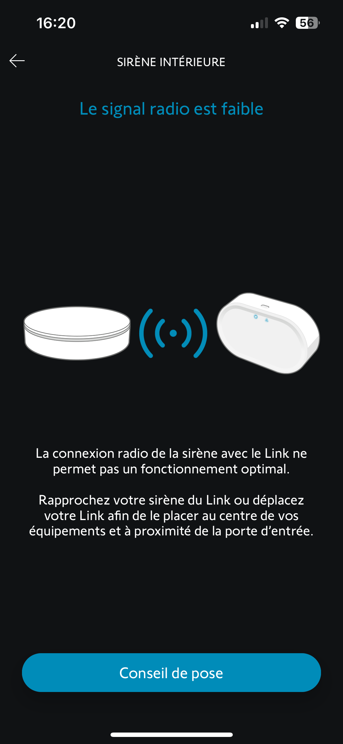 Le signal radio est faible bien que la sirène intérieure soit installée à quelques mètres du Link advanced.