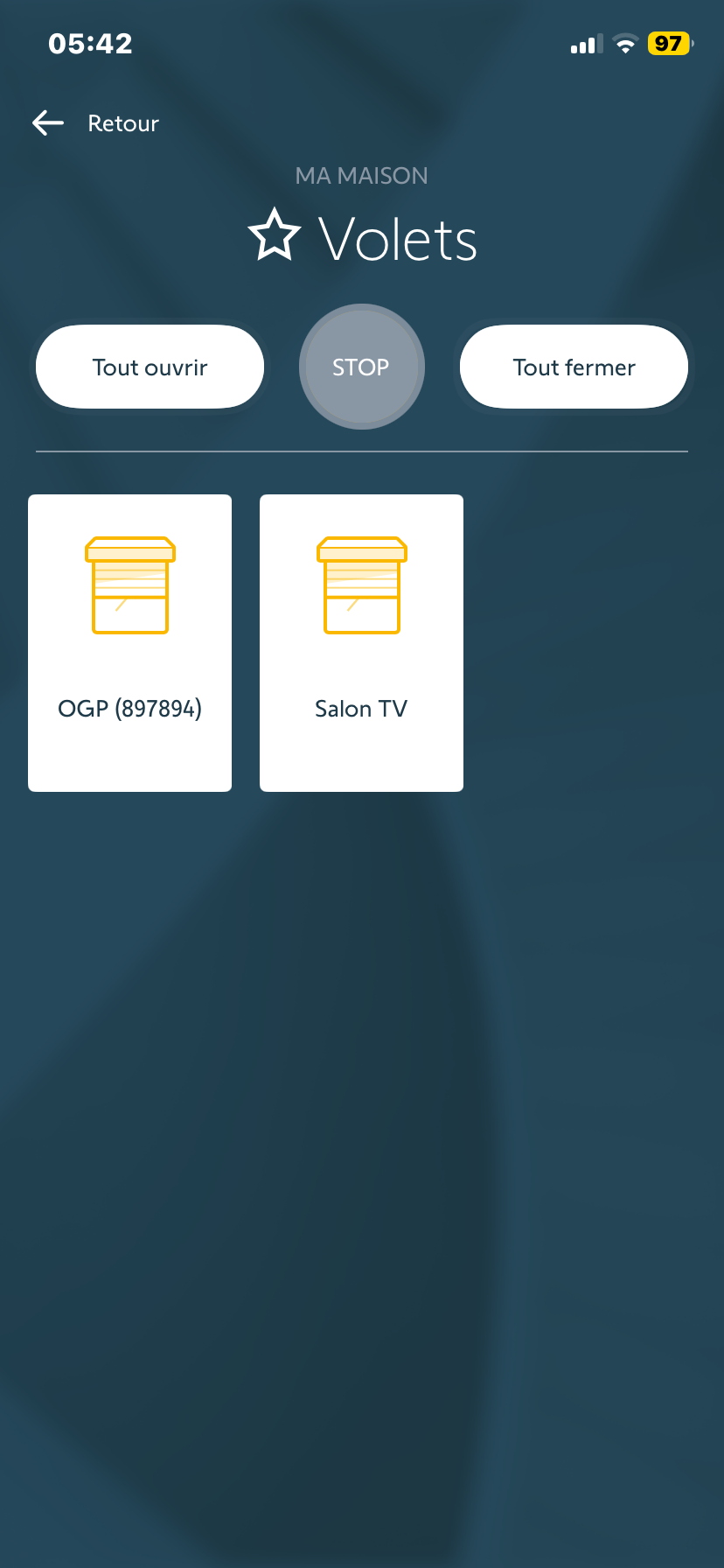 tous les volets fonctionnent bien, sauf celui que j'a renommé "volet qui ne fonctionne pas" (sur lequel j'ai du changé le condensateur, et je l'avais désappairé de la box avant la réparation; suite à la réparation, impossible de le réassocier alors qu'il marche parfaitement avec sa télécommande).