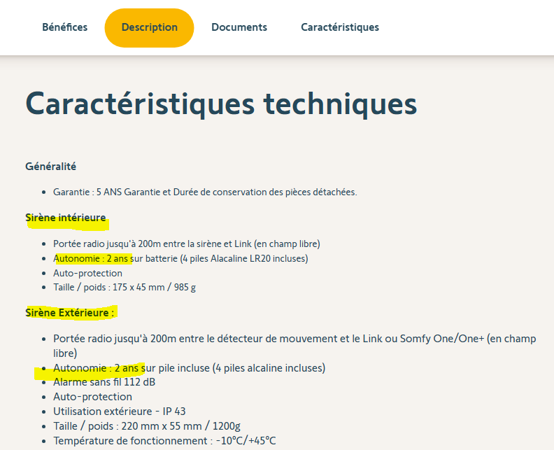 sirène intérieure et exterieur je les ai changé au bout de 3 ans. Capteurs de mouvement j'ai changé les piles au bout de 4 ans pour 3 sur 4 et le dernier cet année au bout de 5,5 ans !!