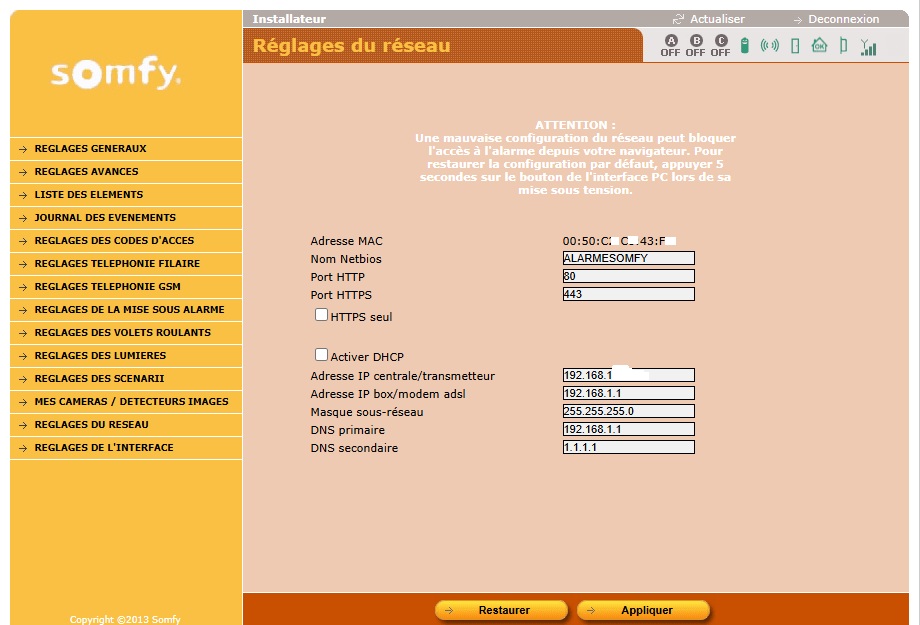 Si vous arrivez sur la page d'accueil de l'alarme c'est que le paramétrage est OK