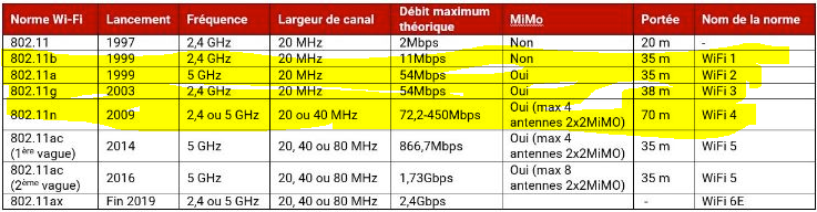 La fibre n'a jamais améliorée la vitesse du wifi qui est définit pas des normes. Je vous met le tableau récapitulatif avec en jaune les normes acceptées par le matériel Somfy.