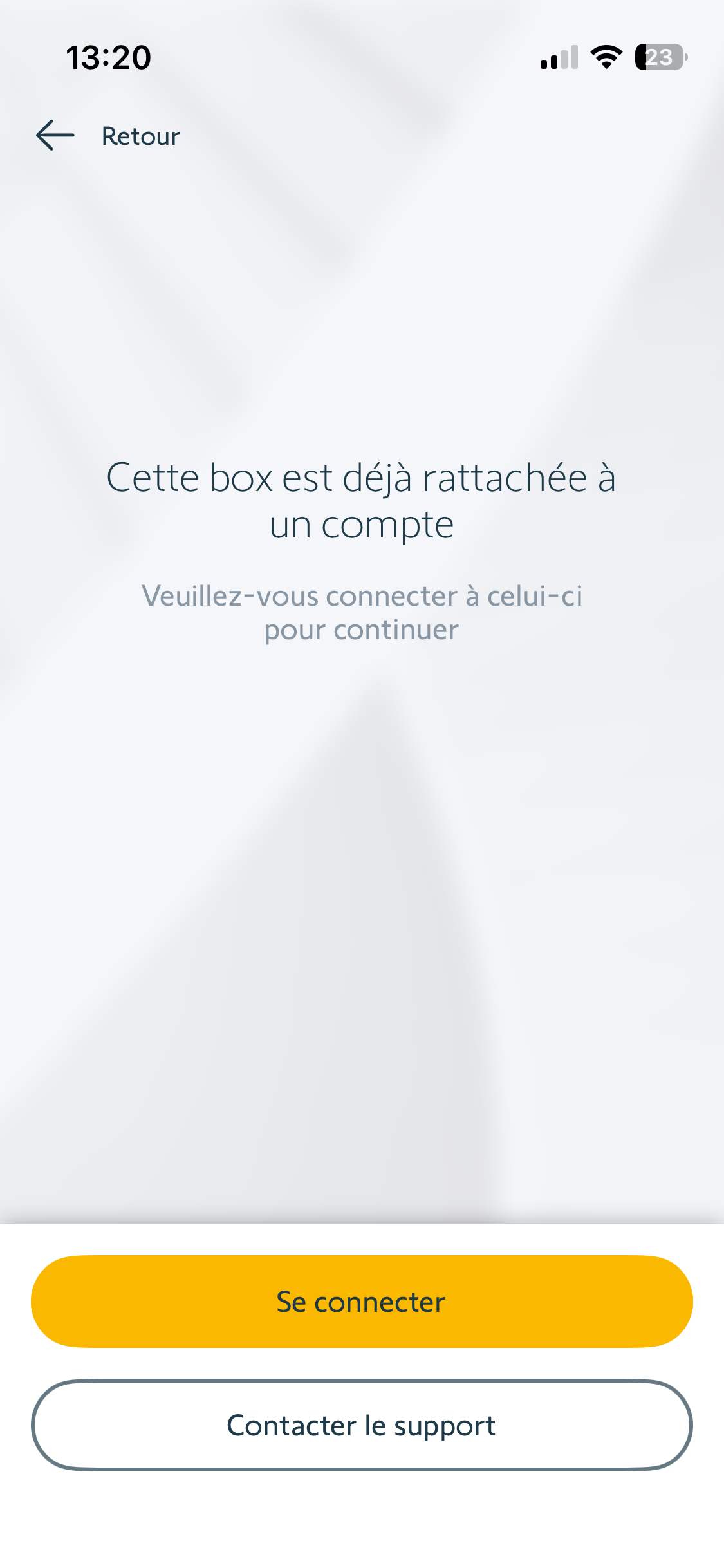 Lorsque que j'essaye de la connecter, l'appli me signale que la box est déjà rattaché à un compte.