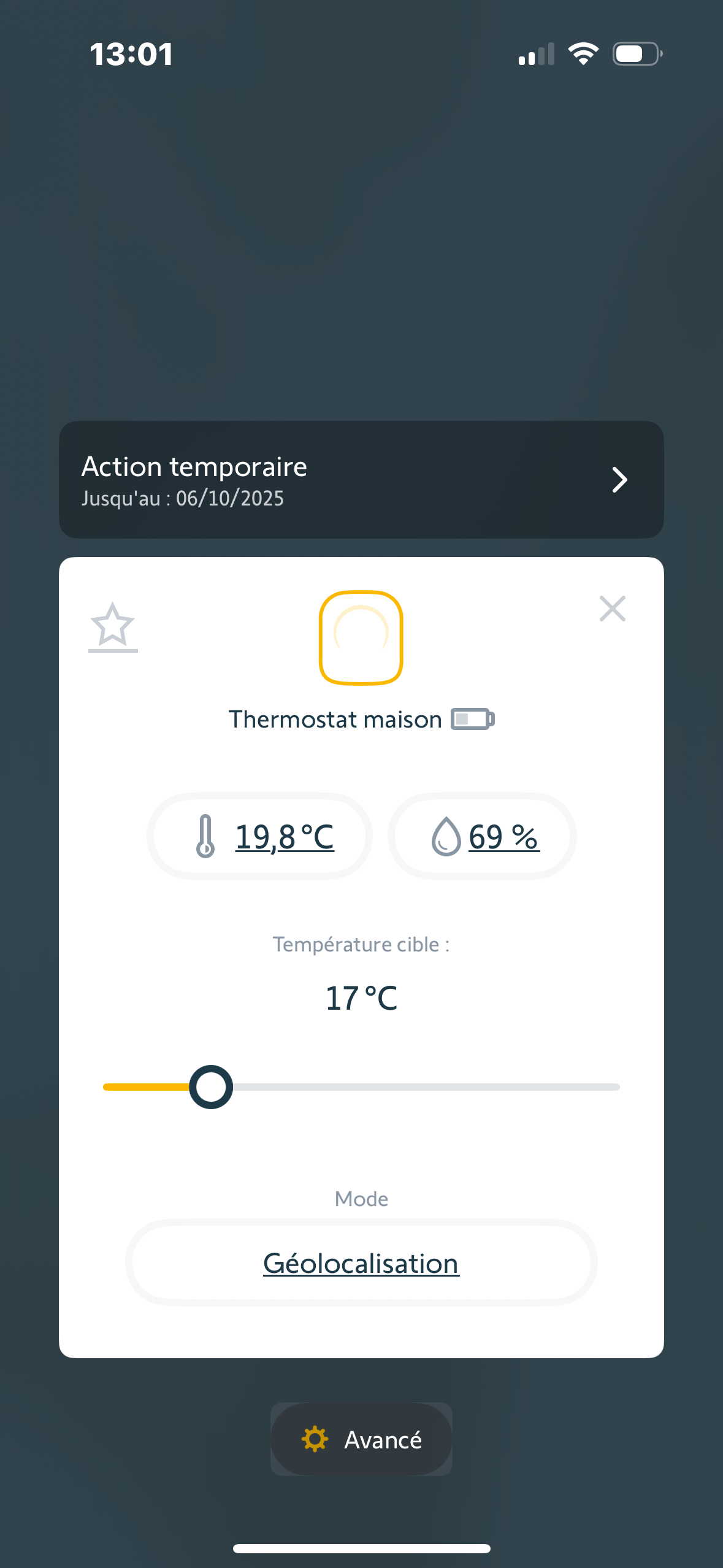Mon petit PB est le suivant lorsque je modifie la valeur de consigne dans l'appli de mon thermostat elle n'est pas prise en compte lorsque je vais voire avec l'appli tahoma et bien souvent vice versa et même si je la modifie direct sur l'écran du thermostat elle n'apparait pas changée dans les appli thermostat et tahoma, j'ai toujours un décalage de mise a jour entre les deux appli ( thermostat et tahoma ) et l'écran de mon thermostat.