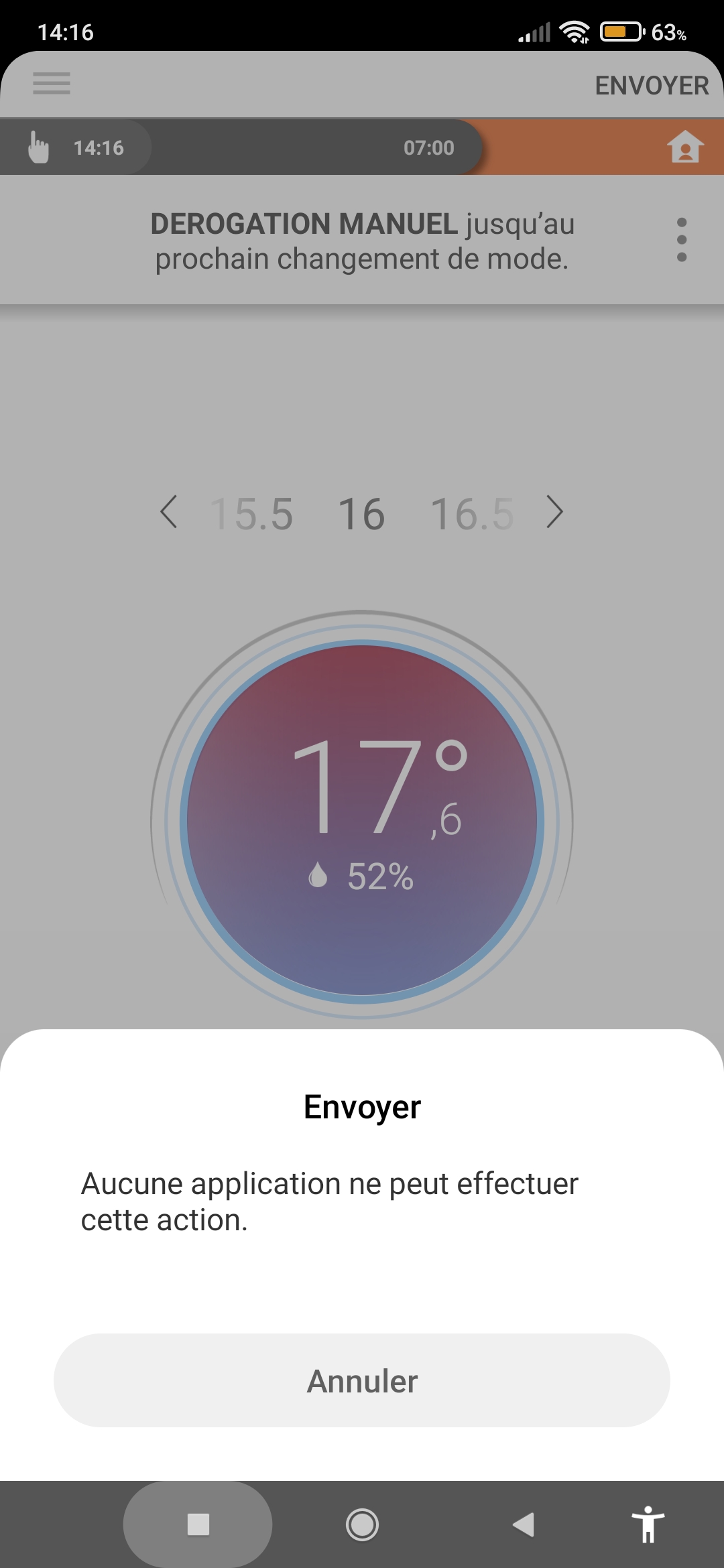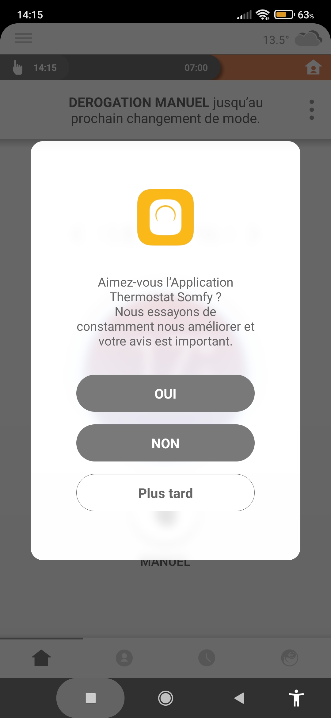 Rebonjour Madame, j'en profite pour signaler une autre anomalie, nous recevons sans arrêt une demande d'avis sur l'appli Thermostat, c'est agaçant surtout que l'on ne peut pas y répondre comme vous pouvez le voir sur les copies d'écran jointes et cela sur plusieurs téléphones différents.