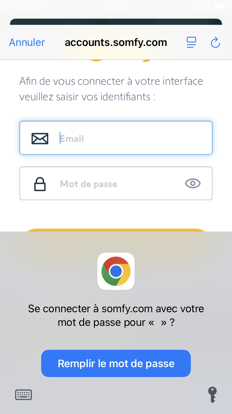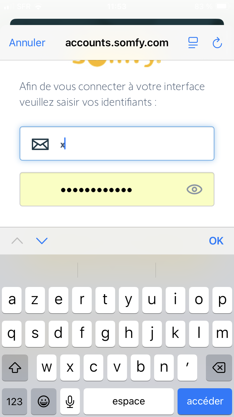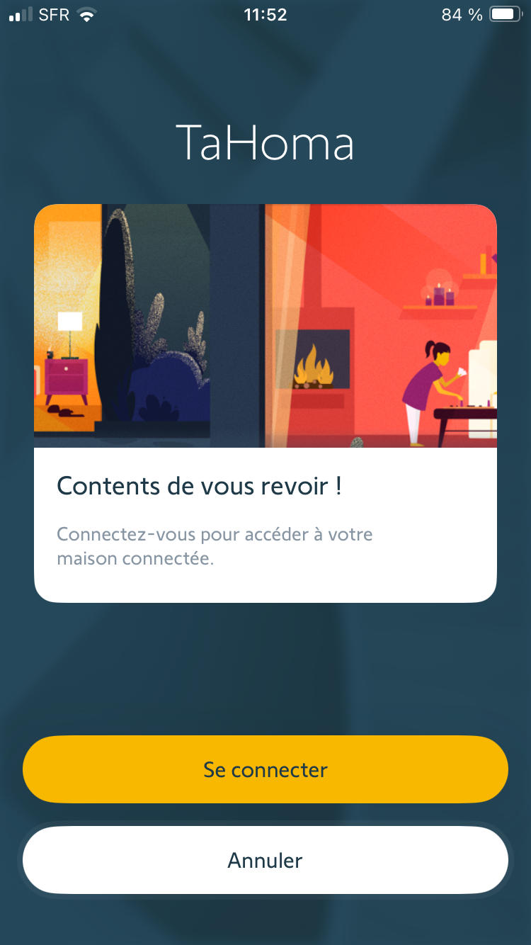 Après cet écran, soit je me connecte et c'est bon soit j'ai une message ''un erreur s'est produite''. il me faut donc, pour le coup : Fermer l'application et la rouvrir pour avoir l'écran TAHOMA.