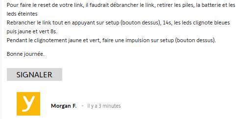 Cela fait plusieurs mois que j'ai le message d'erreur "un équipement mérite votre attention" et j'ai essayé plusieurs fois de faire un "état du système" en bougeant tous les ouvrants sur lesquels les intellitags sont fixés mais rien n'y fait. Je suis tombé sur un discussion qui correspondait à mon problème et où la solution avait été de réinitialiser le link advanced. Ce que j'ai fait ce soir mais du coup maintenant les deux voyants clignotent bleu à tour de rôle.