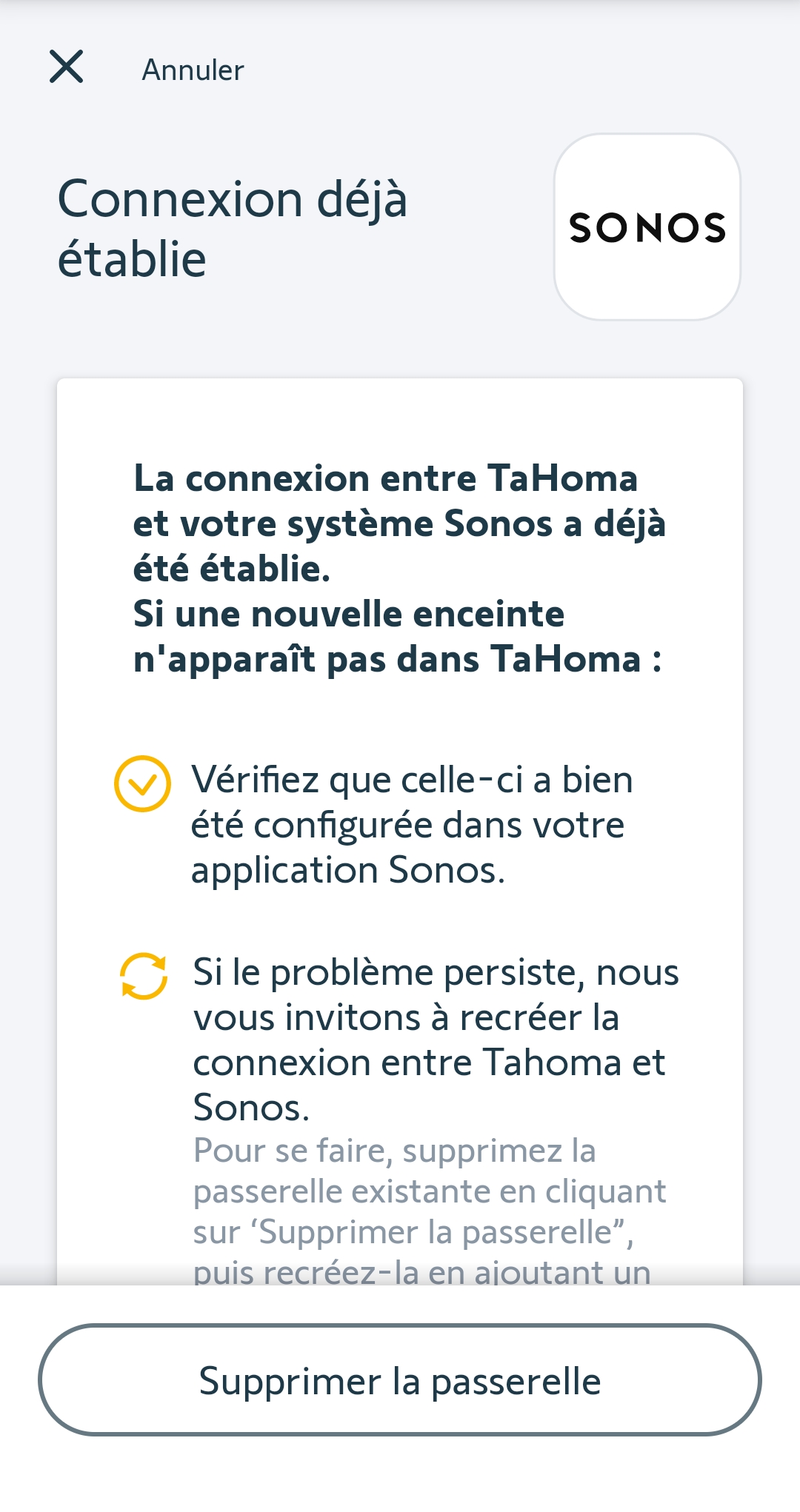 J'ai déconnecté toutes mes enceintes et demandé dans l'application de supprimer la passerelle sans succès.