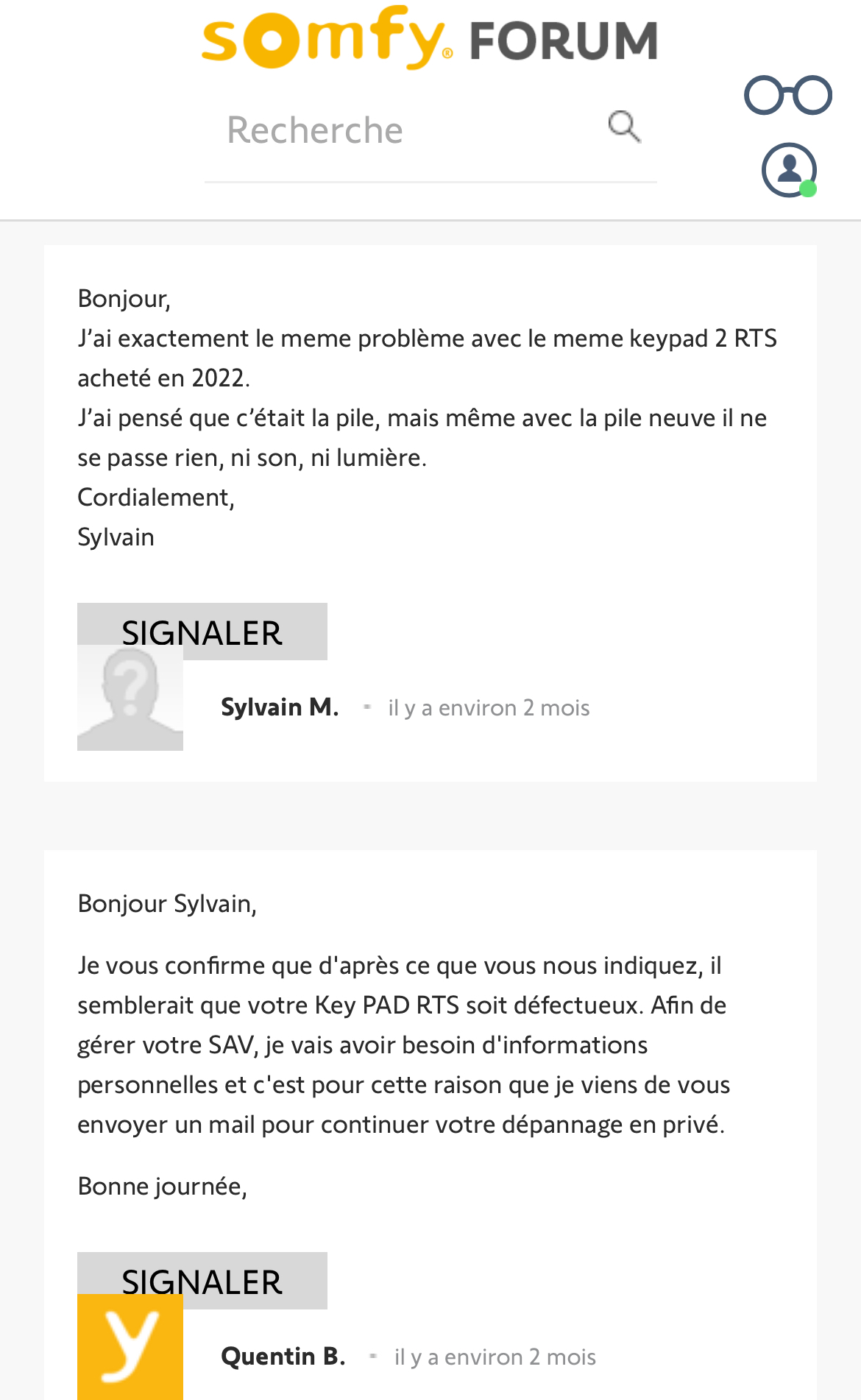 Je vous confirme que d'après ce que vous nous indiquez, il semblerait que votre Key PAD RTS soit défectueux. Afin de gérer votre SAV, je vais avoir besoin d'informations personnelles et c'est pour cette raison que je viens de vous envoyer un mail pour continuer votre dépannage en privé.