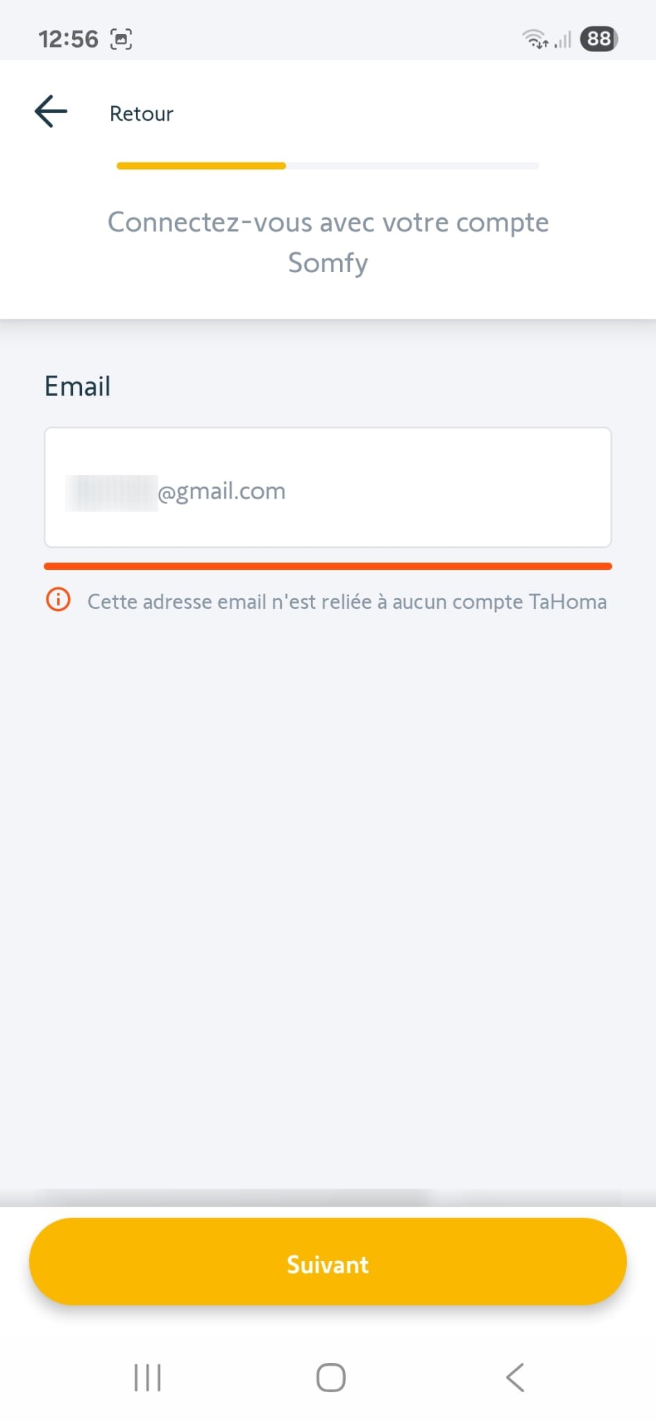Vous avez créé un compte chez Somfy et il n'est pas relié a une Tahoma : " Cette adresse email n'est reliée à aucun compte Tahoma".