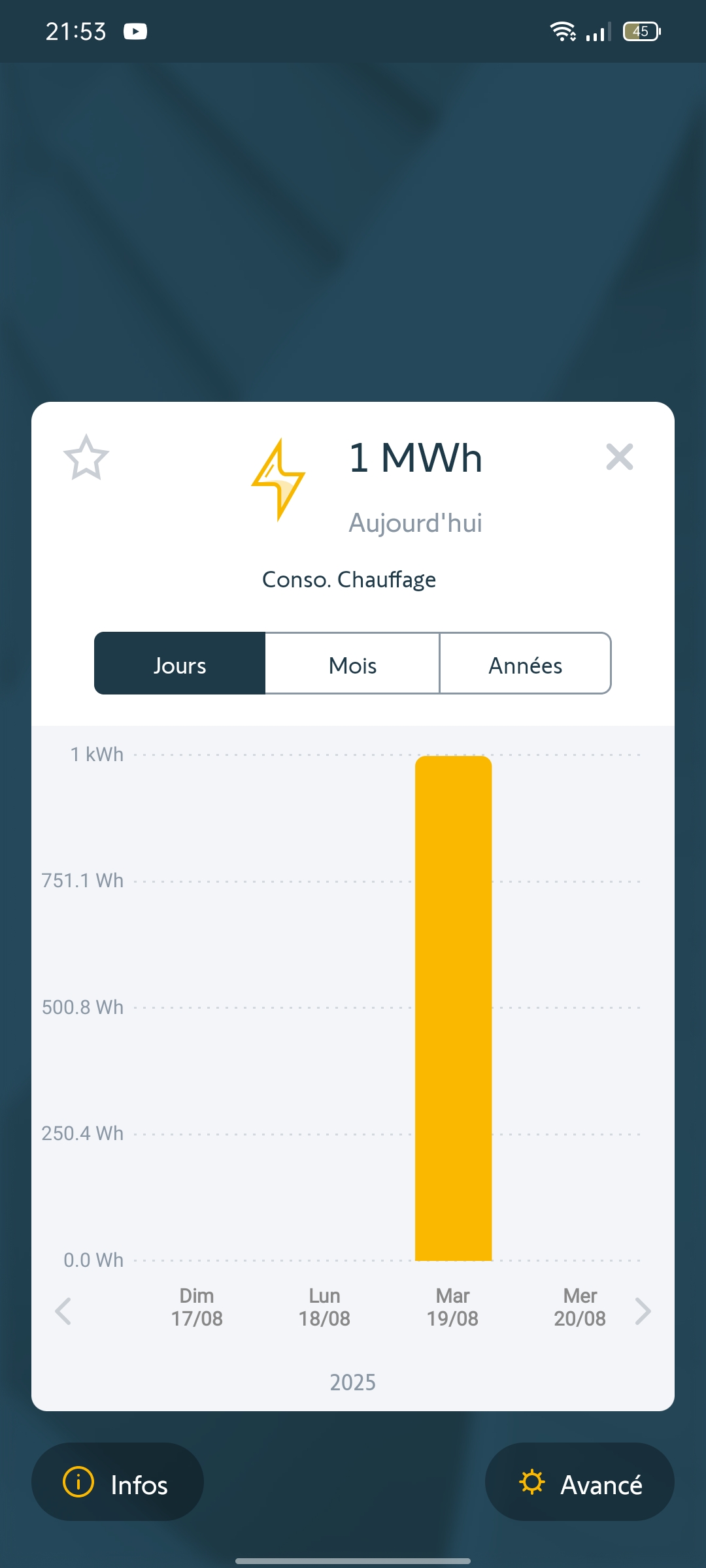 En effet contrairement à votre dernière réponse, la consommation de la PAC Atlantic indique bien zéro sur les 7 derniers jours en chauffage, preuve en est la photo ci-jointe, alors que l'appli Tahoma Somfy indiqué toujours une consommation de 1kwh tous les 3/4 jours (photos ci-jointes prises aujourd'hui même 20/08/25). Le problème est bien côté Somfy, pas besoin de solliciter Atlantic selon moi.