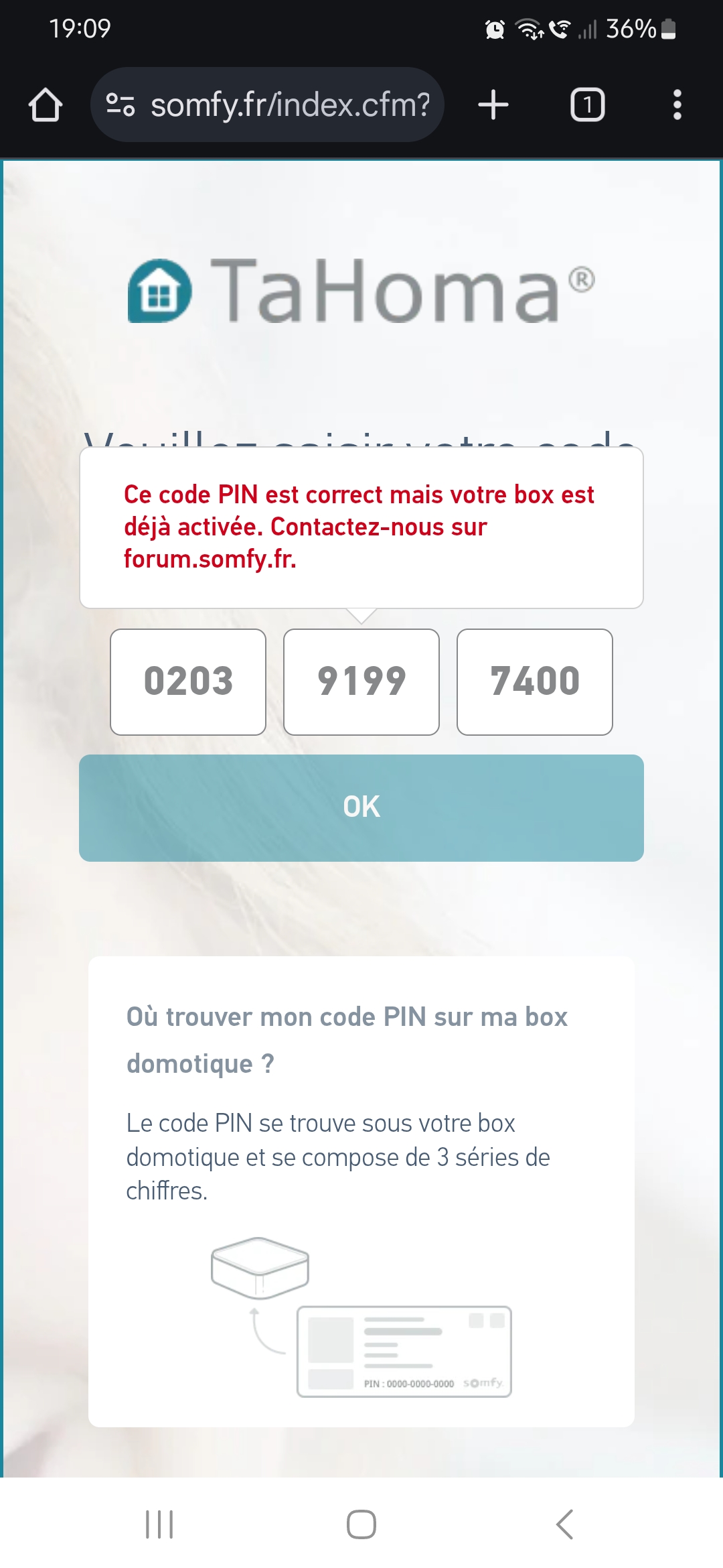 Le problème c'est que je ne sais plus l'ajouter via https://www.somfy-connect.com car il m'indique que le Code PIN n'existe pas, alors que c'est bien le code PIN noté sur la BOX Tahoma