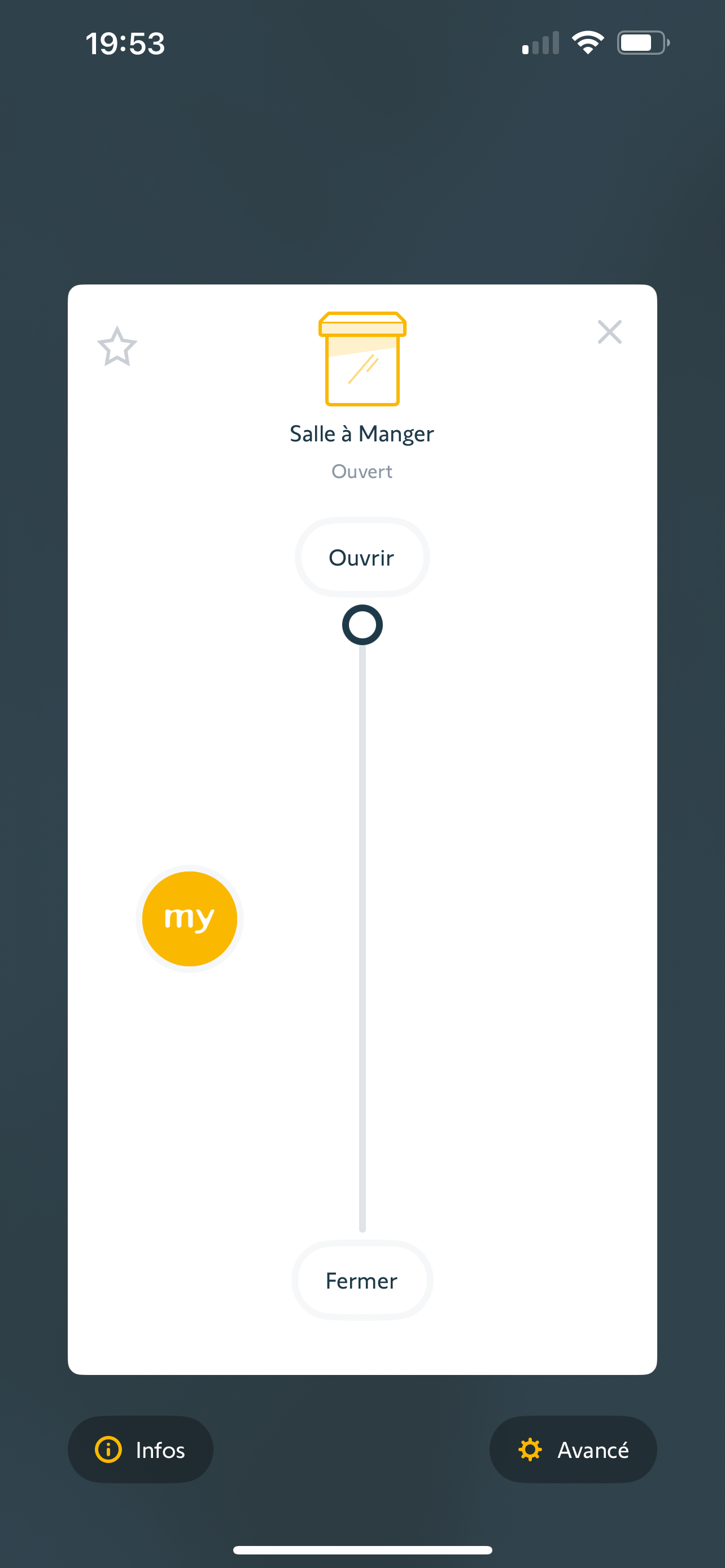« My » qui devient « STOP » quand une commande est lancée sur l’Appli, arrête de tourner !!! … Du coup, l’apprentissage du 100% Ouvert ou Fermé s’est fait instantanément sur l’Appli …