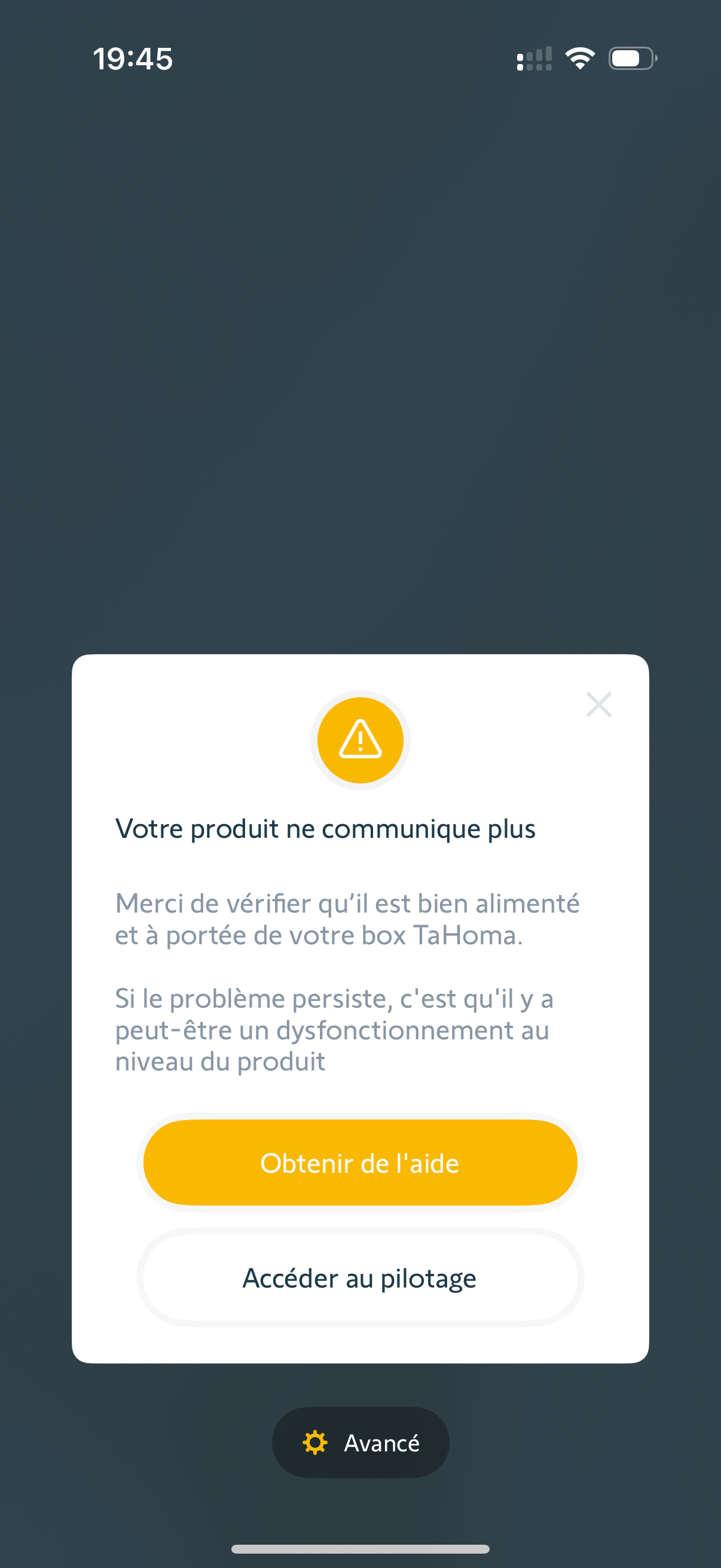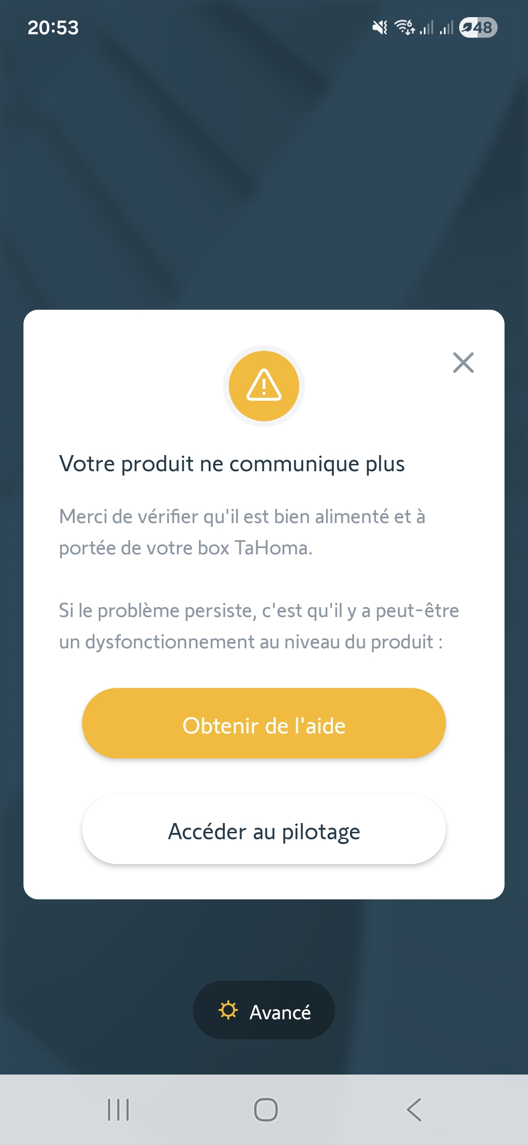 L'installation de la Tahoma Switch a fonctionné mais je rencontre un problème lorsque je lui ajoute mon compte Somfy protec. Après avoir lié les deux comptes, un message d'erreur s'affiche "pilotage impossible la connexion avec votre produit a expiré, veuillez vous reconnecter". Lorsque je cherche à me reconnecter c'est ensuite un deuxième message qui s'affiche :votre produit ne communique plus. Merci de vérifier qu'il est bien alimenté et à portée de votre box Tahoma. Les équipements sont tous dans la même pièce.