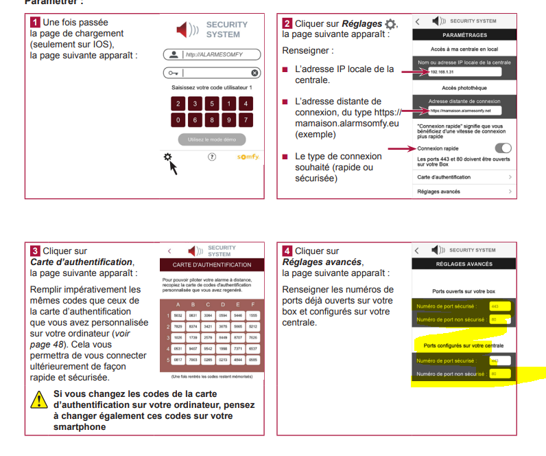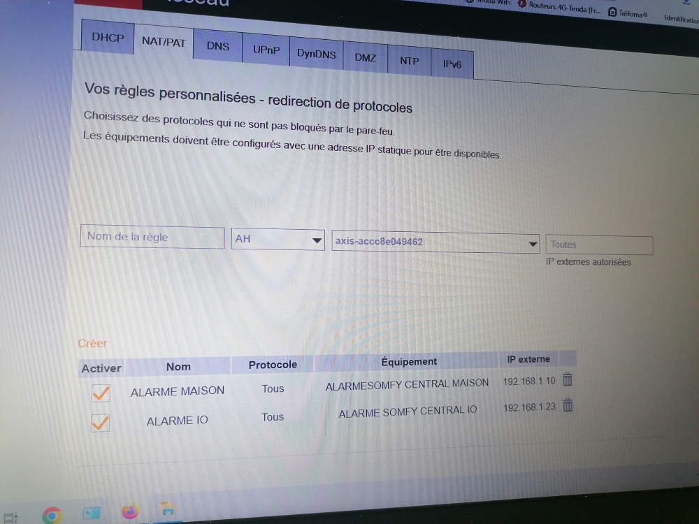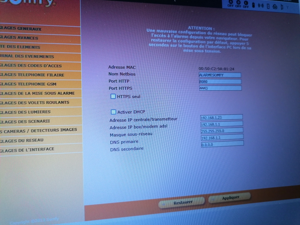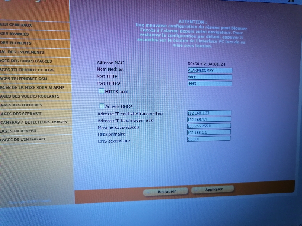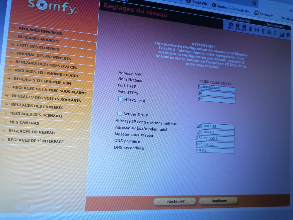 PS : solaizealarme.alarmesomfy ;;; centrale N° 594728 IP 192.168.1.10 Port inter 443 port ext 80