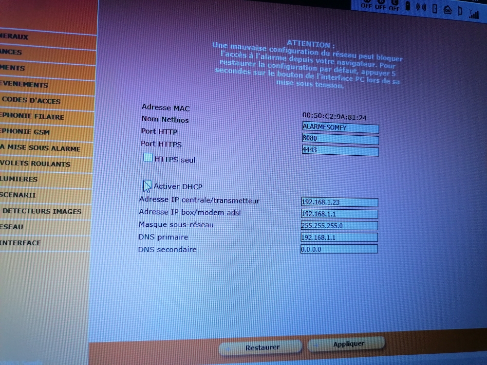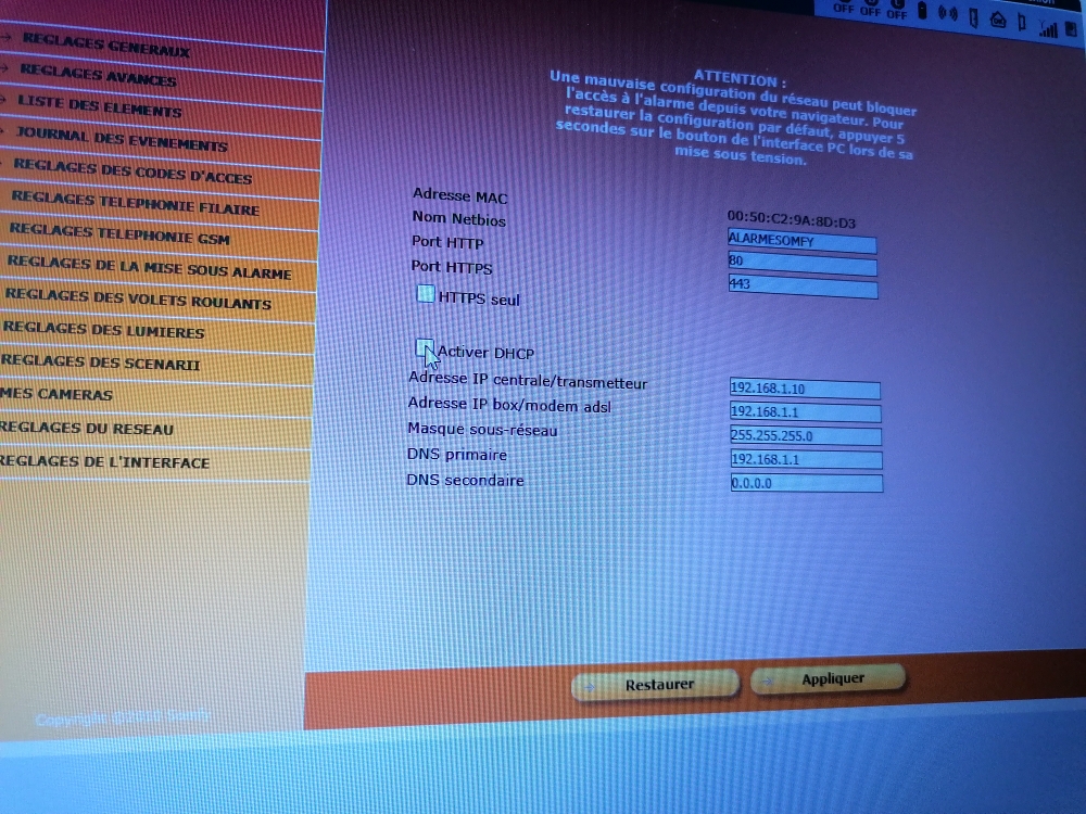Centrale maison N°594728 IP 192.168.1.10 P: 80 443