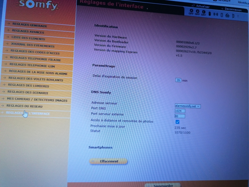 Bonjour, je reviens sur le serveur Somfy comme sur les photos envoyer j'ai reprogrammer mes deux centrales.je me connecte solaizealarme.alarmesomfy.net je suis dirigé sur la central IO et no sur la central maison. Et sur alarmecampingcar.alamesomfy.net pas de résultat merci