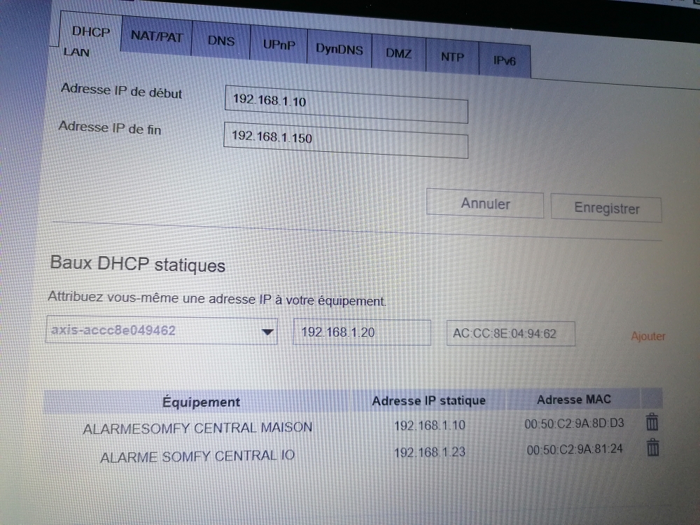 Bonjour à tous, après deux mois de galère je reviens vers vous tous, j’ai changé ma LiveBox 6 auprès orange mais rien de concluant, en relisant les réponses que vous m’avez faite sur IP défectueuse j’ai compris que c’était le module de la centrale qui était défectueux. Etant donnez que Somfy ne fait plus de pièce détacher j’ai trouvé une centrale d’occasion une des dernières vendues en IO et RTS non enregistrer sur le serveur Somfy. J’ai tous reprogrammer et tous fonctionne avec IP en direct sur mes deux centrales (IP 192.1.1.23 alarmecampingcar central n°531822. IP 192.168.1.10 solaizemaison central n°594728. Mais problème avec le serveur Somfy. Quand je me connecte avec le sous domaine solaizealarme. Je suis sur la centrale (531822 mon camping-car) et non sur la solaizealarme. Et l’inverse sur le sous domaine alarme campingcar impossible de se connecter. Je pense que j’ai du faire une erreur a quelque part, je joint toute la configuration que j’ai fait et merci pour votre réponse