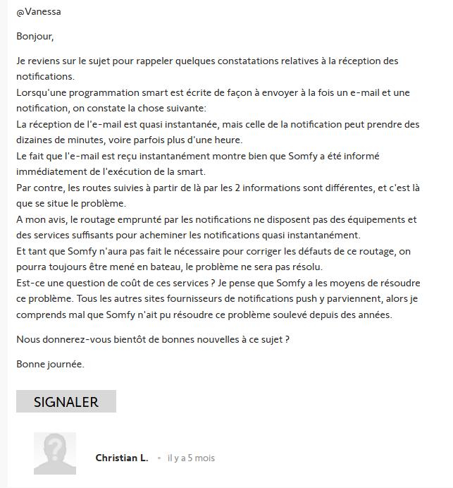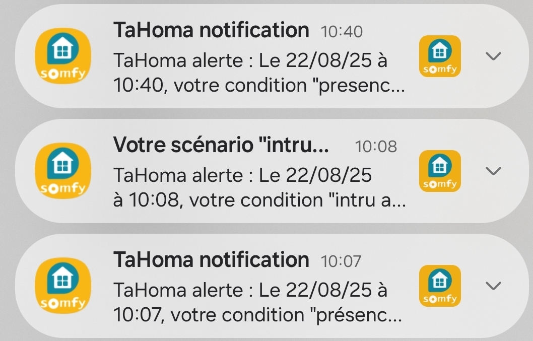 Et, pour ne pas passer pour un " newbie ", j'utilise ce système de notification depuis 10 ans, date à laquelle j'ai crée mon compte et j'ai commencé à me " spécialisé " Somfy, c'est d'ailleurs pour ça que j'ai conservé ma tahoma V2 et que j'ai acheté une tahoma switch en parralèle, pour ne pas perdre la gestion des capteurs et détecteurs de mon alarme Protexiom.
