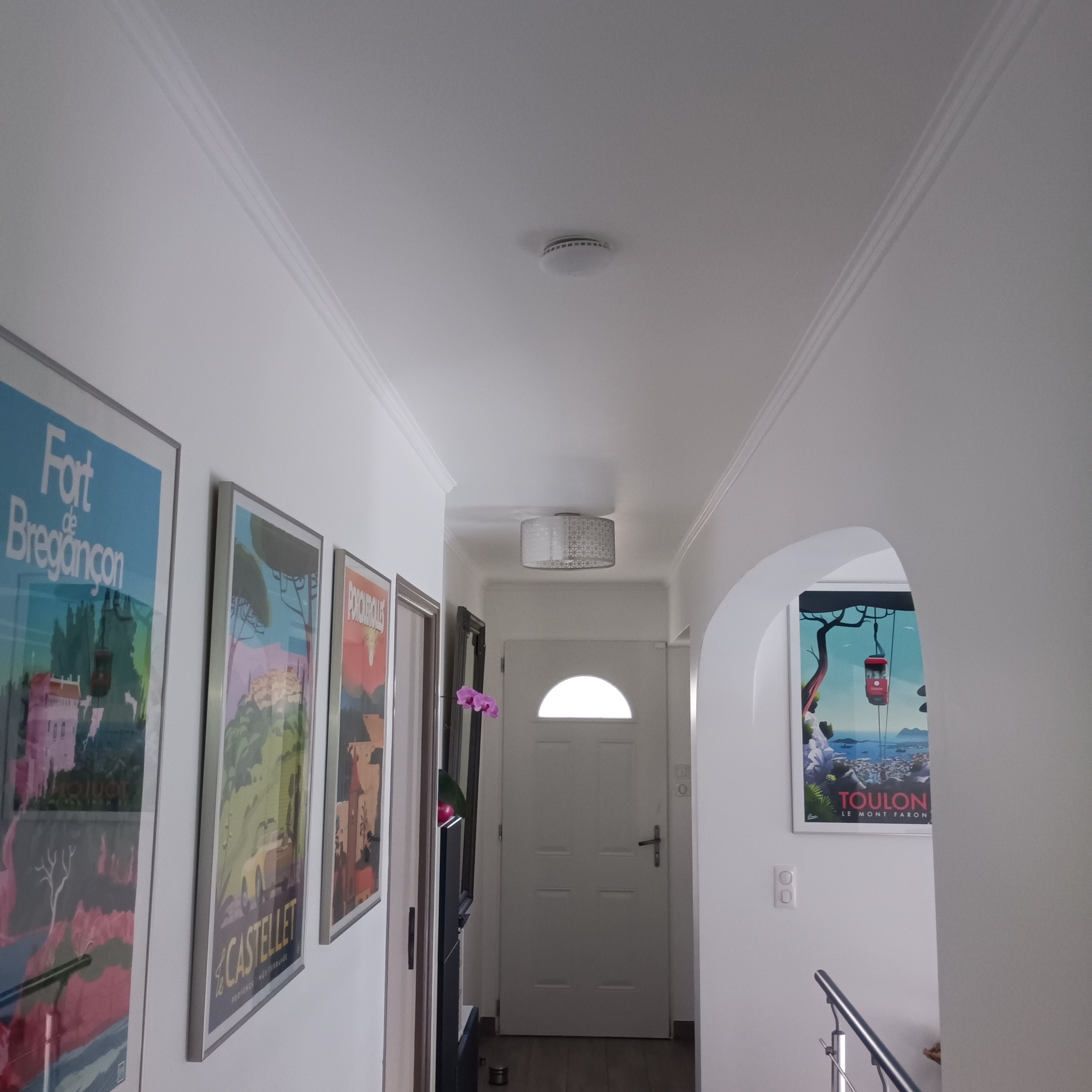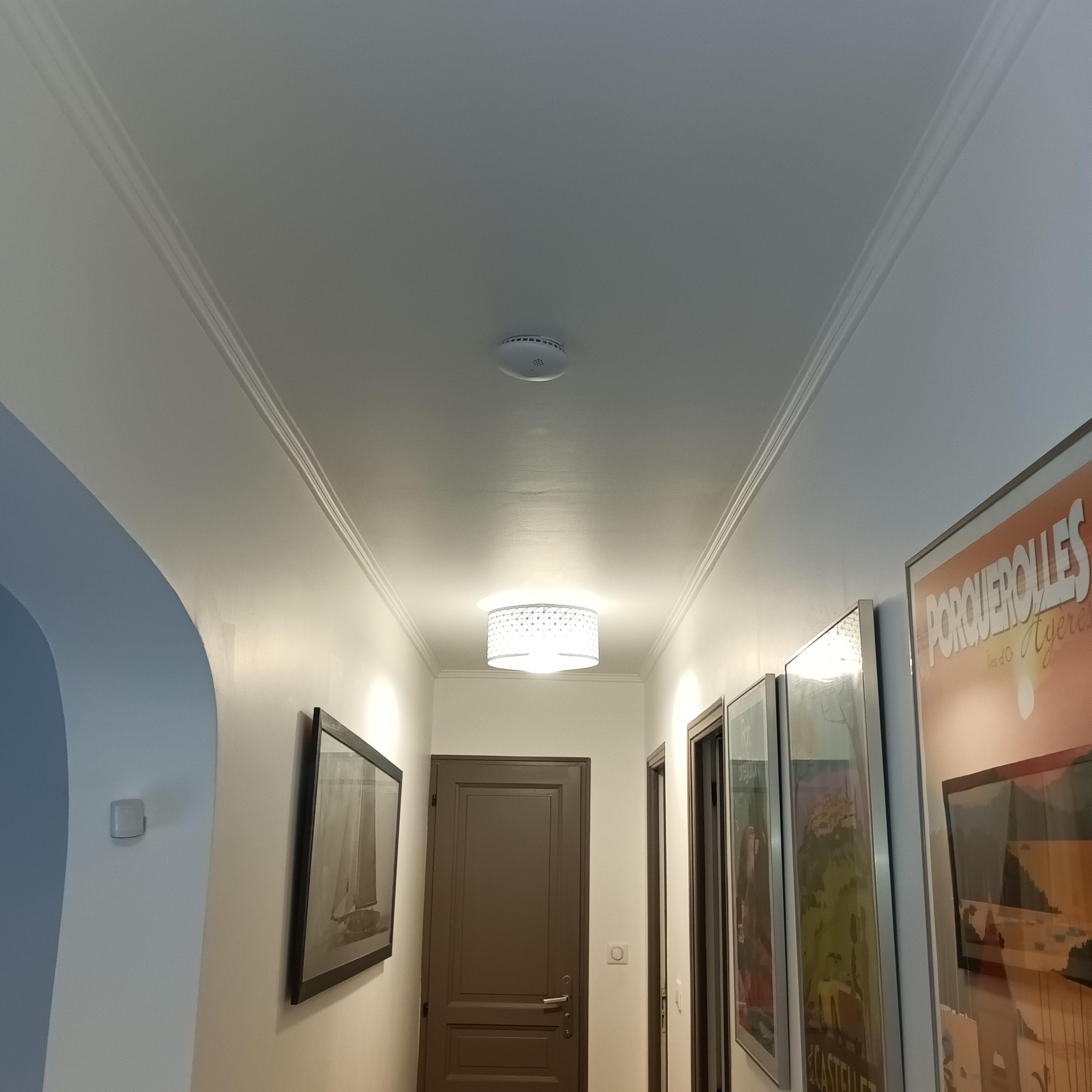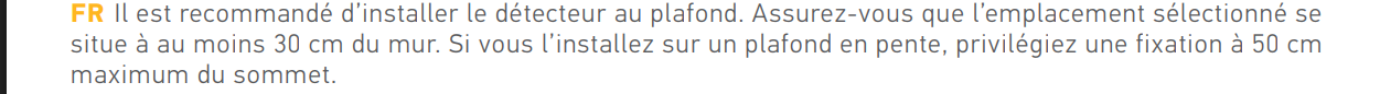 Bonjour Morgane, je vous confirme que ce dernier est normalement installé au plafond. Il n'est pas présent sur la photo car ce dernier sonne de façon intempestive, sans raison et le plus souvent en pleine nuit. J'en avais un avant d'une autre marque qui ne m'a jamais posé problème. Je ne pense vraiment pas que ce soit l'emplacement. Est-il possible de faire un SAV ? Merci Bien à vous