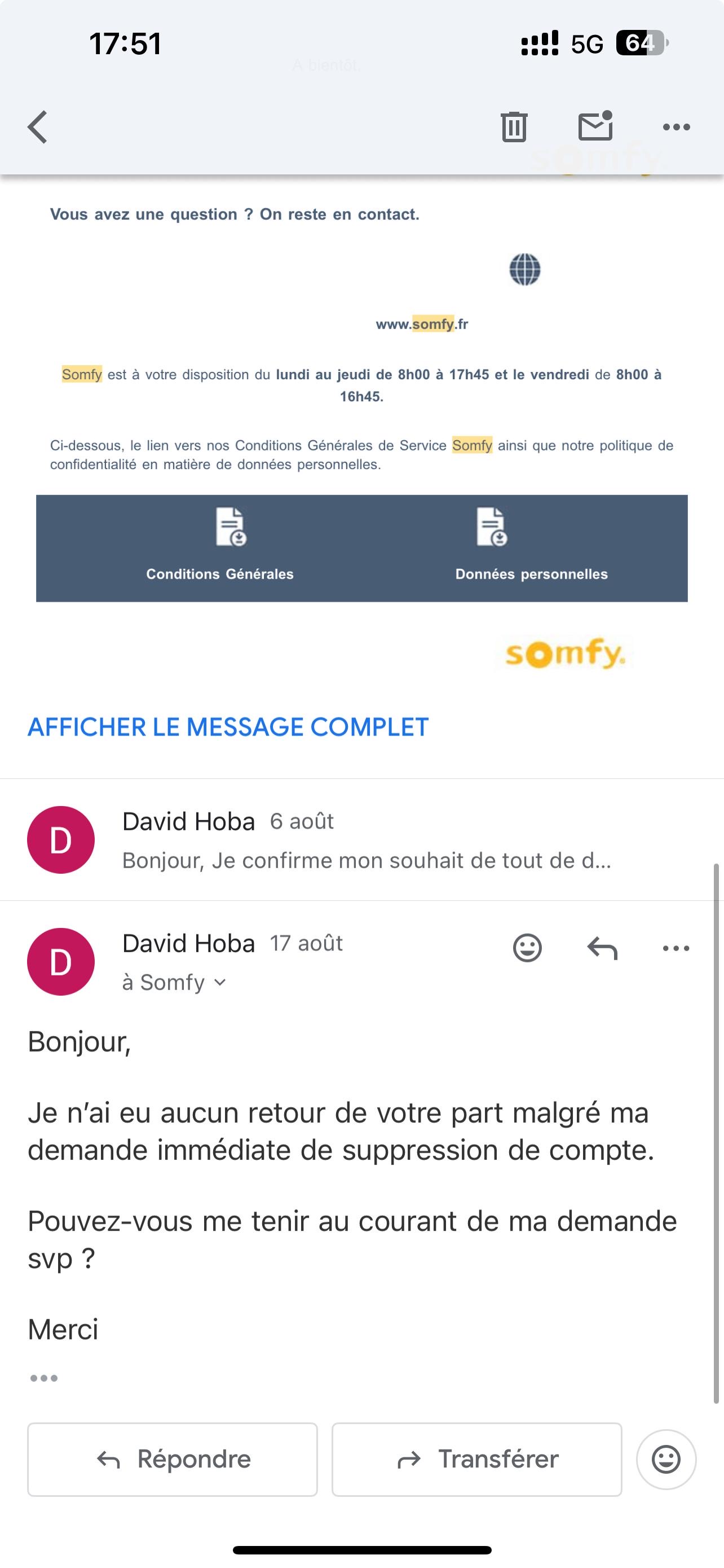 Vous avez introduit une demande de suppression de vos données personnelles via le formulaire accessible sur notre site Internet SOMFY.