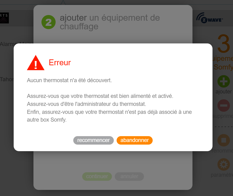 Tout est ok, sauf le thermostat connecté. Il n'était plus installé. En voulant le réinstaller ce jour on a eu le message suivant : voir PJ