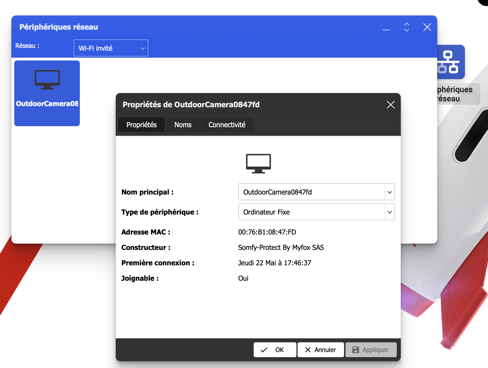Je vois sur notre serveur que votre caméra est connectée au wifi, mais je ne vois à aucun moment la connexion au réseau invité.