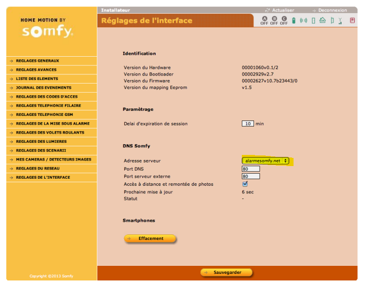 Détourner le paramétrage du serveur DNS de Somfy n'est pas un problème dans la mesure ou c'était prévu dans les anciennes versions de centrale (copie écran 1); mais cette possibilité n'existe plus dans les dernières fabrications (copie écran 2). On ne peut choisir qu'entre "alarmesomfy.net" et "alarmsomfy.eu".