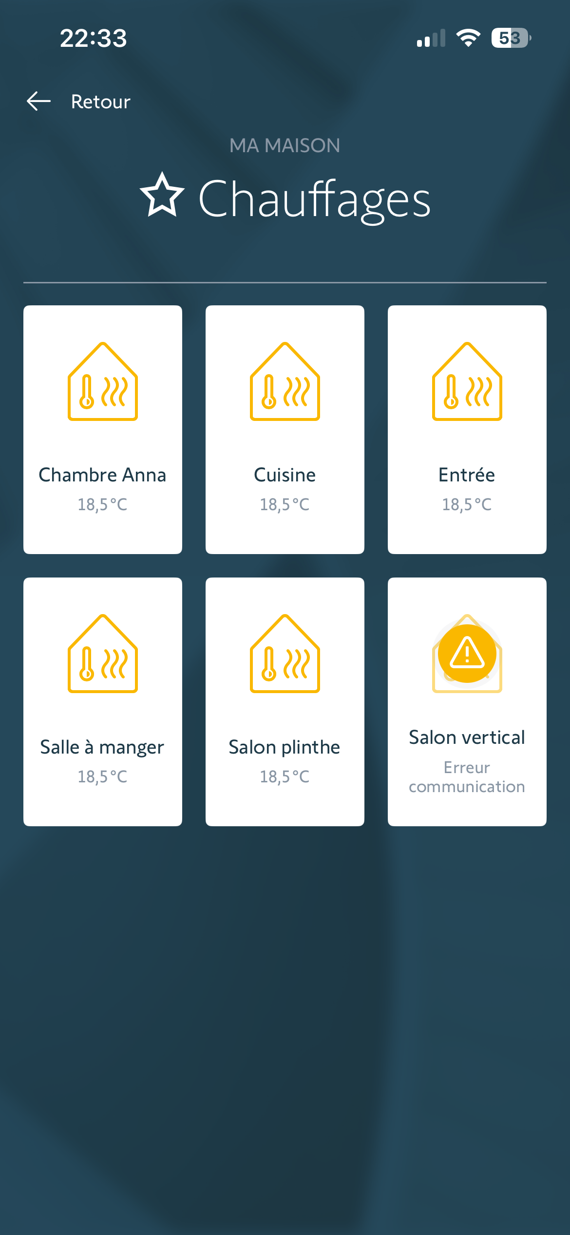 Le radiateur Salon vertical est en défaut car trop éloigné de la box Tahoma donc par moment est en erreur de communication.