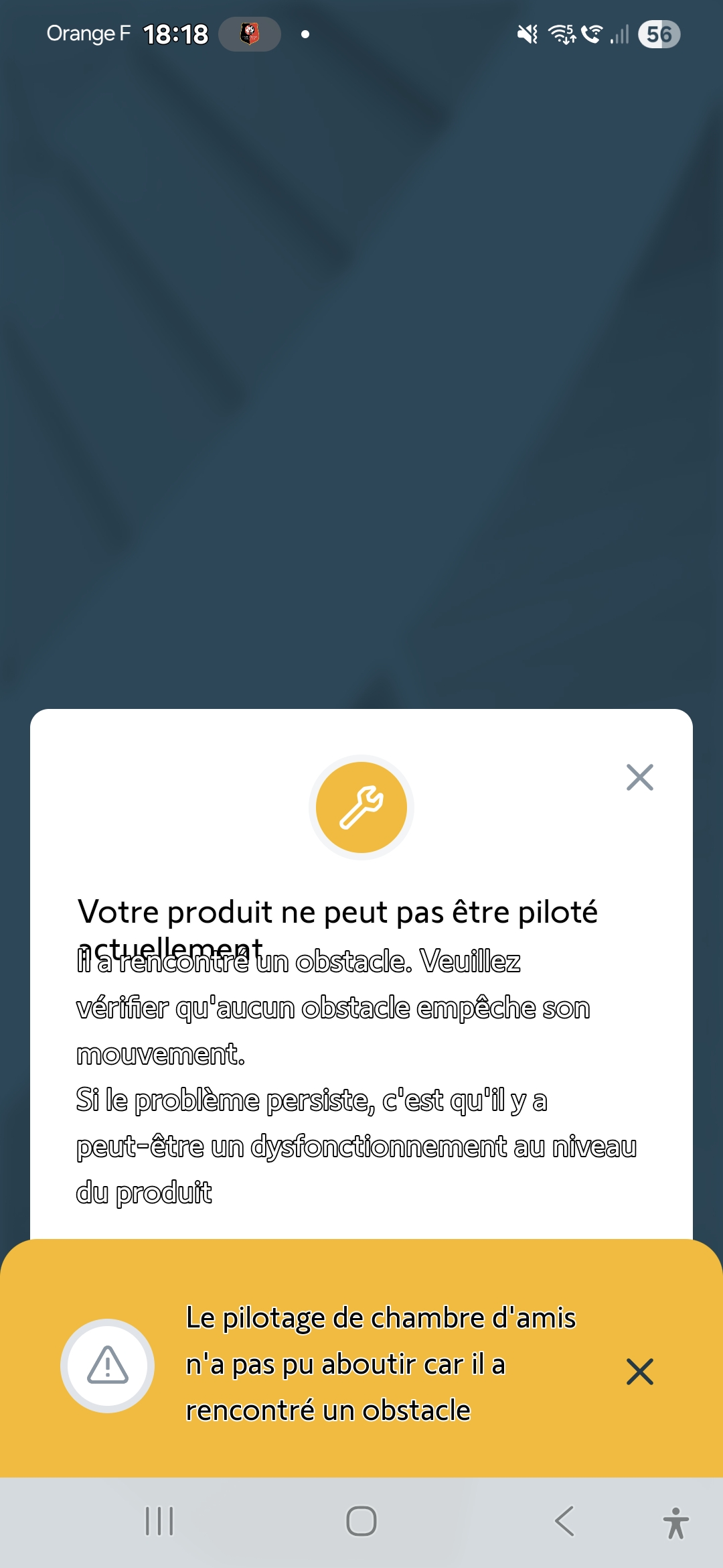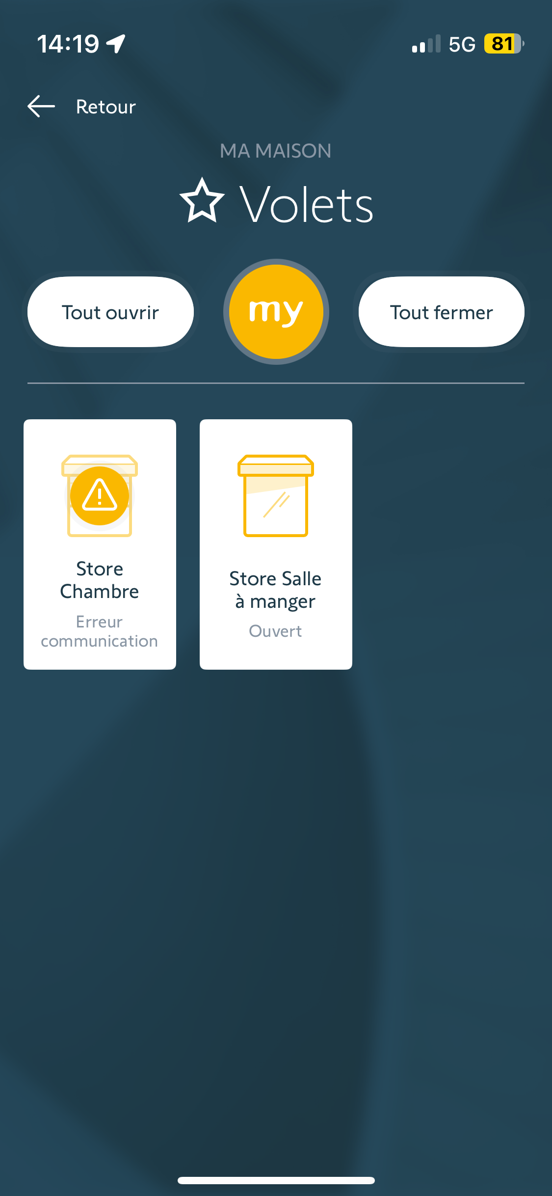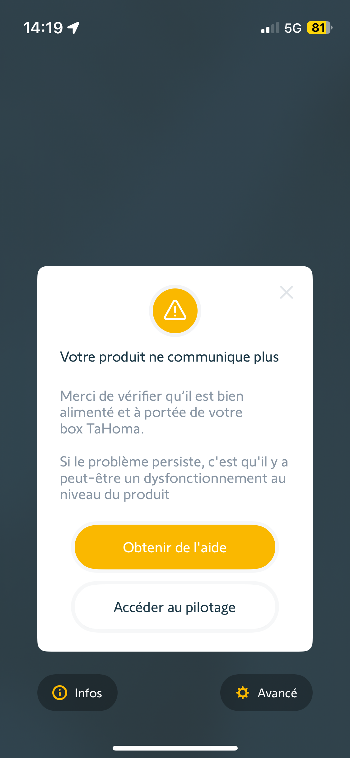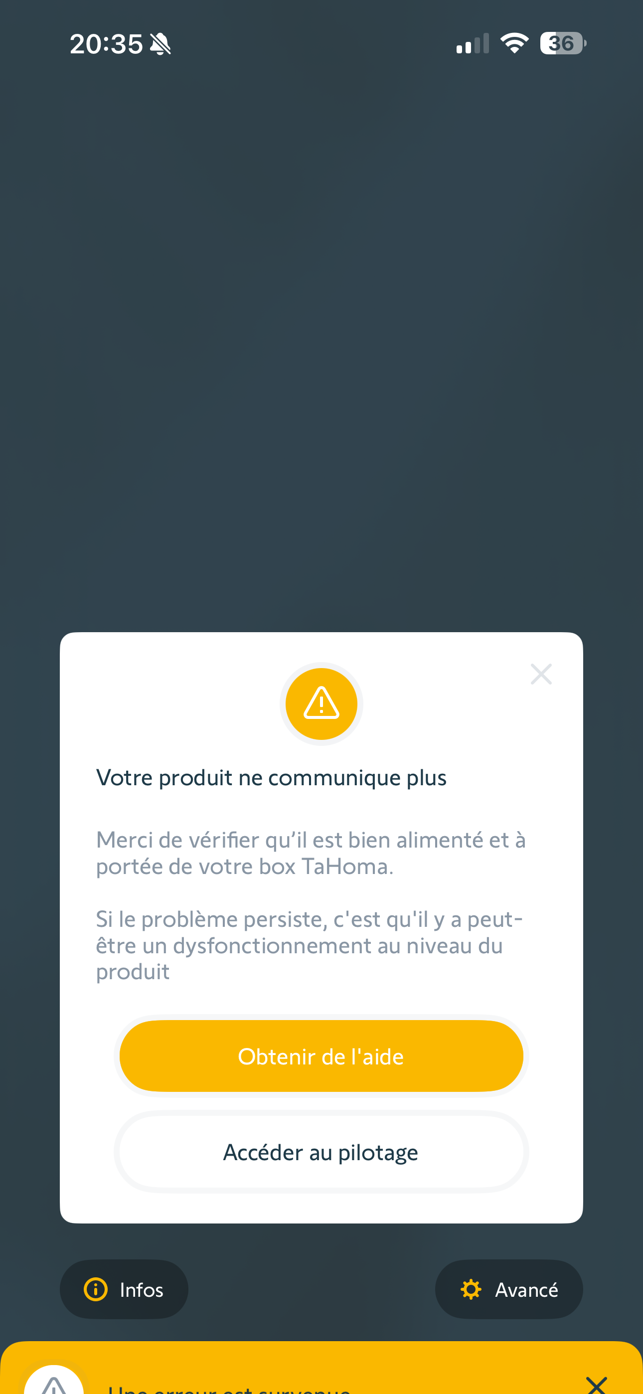 J'ai un message d'erreur sur l'application TAHOMA : "Erreur de communication sur 1 volet roulant (salon). Peut-on m'aider ? Code Pin de la box 2088 - 7526 - 1676