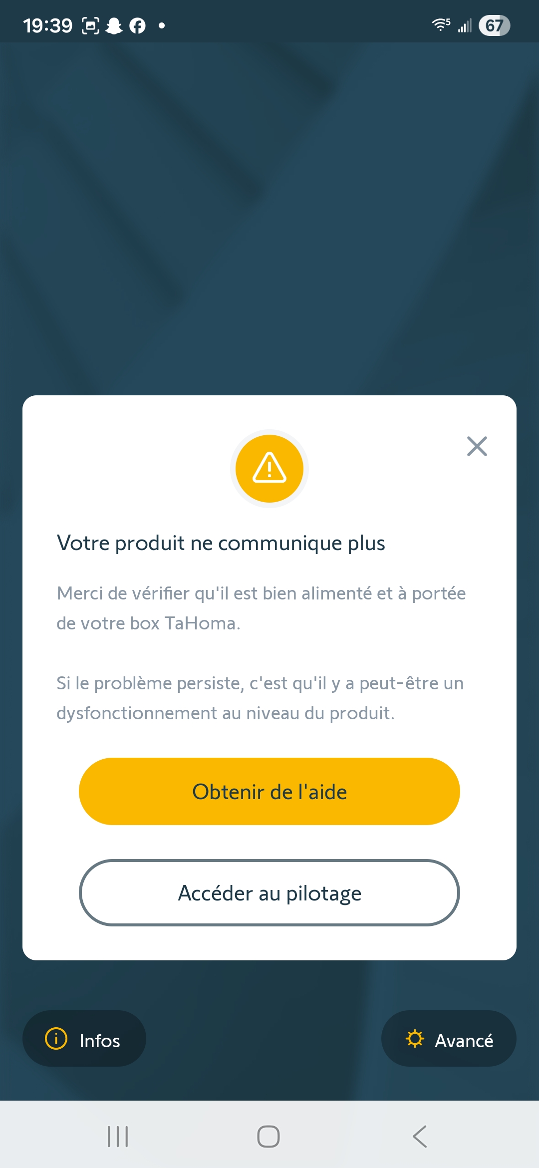 Depuis quelques jours j'ai un message d'erreur qui s'affiche sur l'application tahoma, erreur de communication sur 1 volet roulant, j'ai desinstalle, puis réinstalle le volet il s'affiche bien sur l'application mais impossible de le commander ?